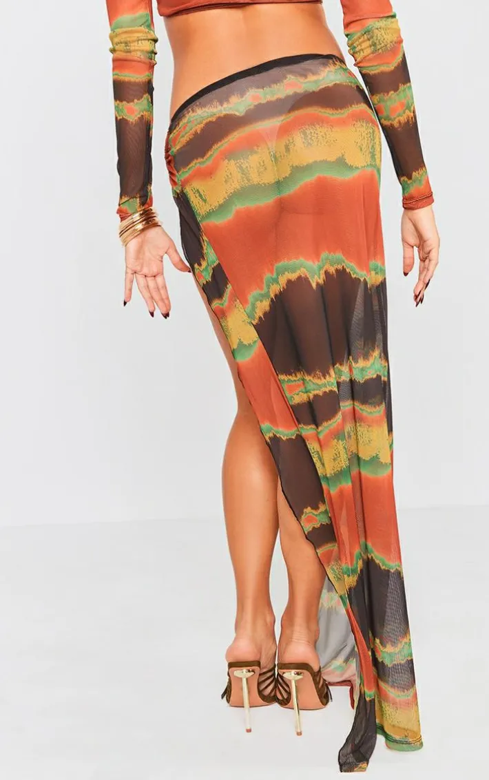 Inject some bold prints into your weekend look with this green tie dye printed mesh ring detail maxi skirt. Brought to you in a green hue mesh material with a tie dye print design, ring detailing and a maxi length, how can you resist? Pair this maxi skirt effortlessly with the matching top, strappy heels and a mini bag for a look that is sure to make you stand out from the crowd.