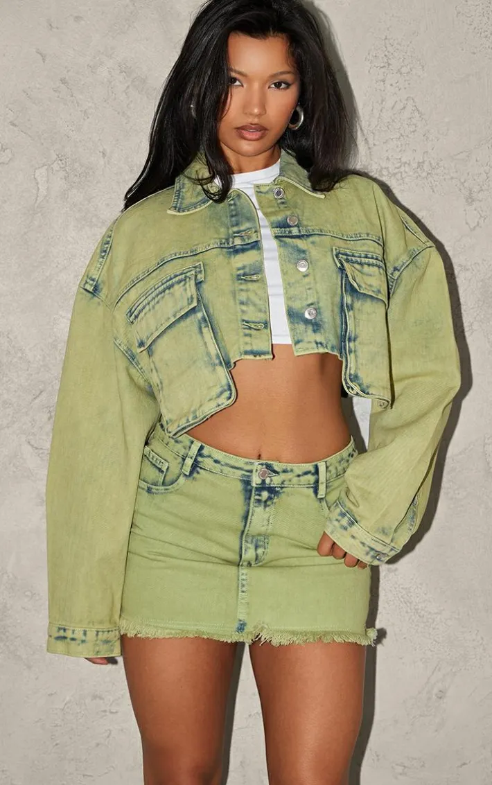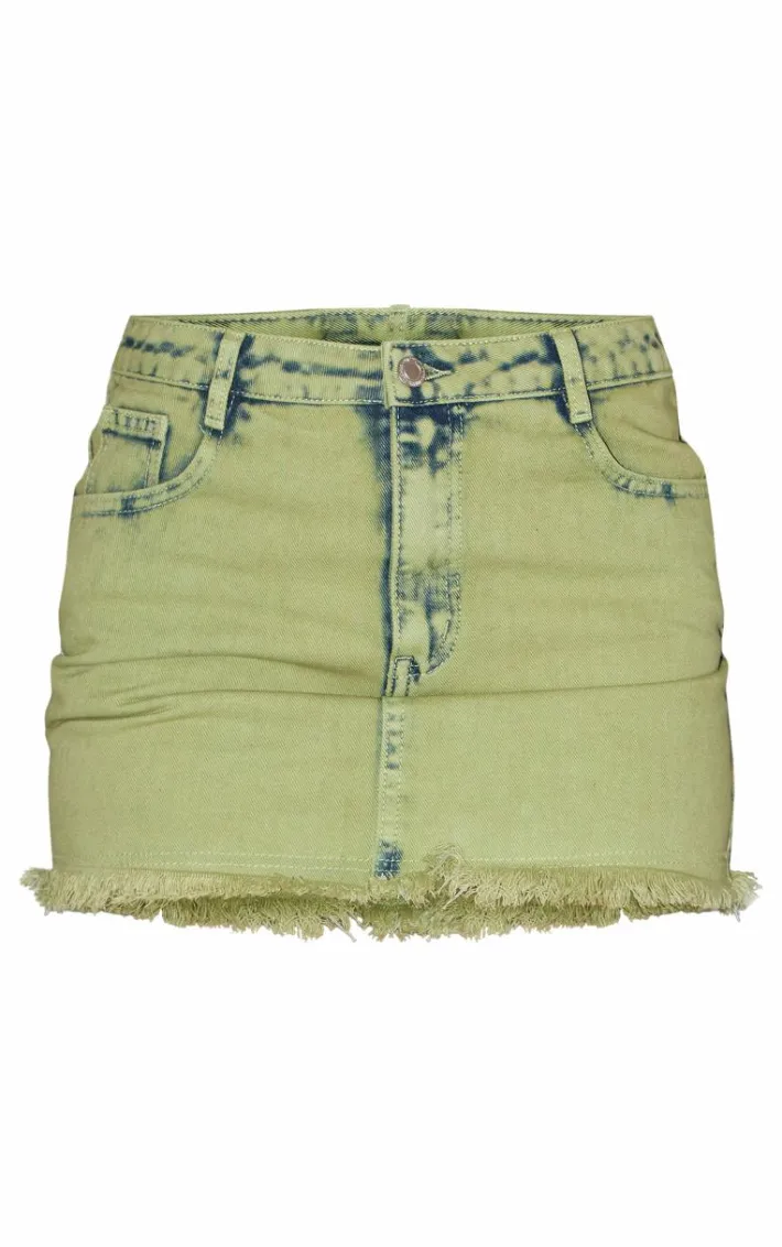Have all eyes on you with this green tint acid wash raw hem mini skirt. This mini skirt is brought to you in a green tiny acid wash material with a raw hem and a mini length, how could you turn this down? Complete the look and style this with the matching jacket, a white tee and boots for a fool-proof finish.