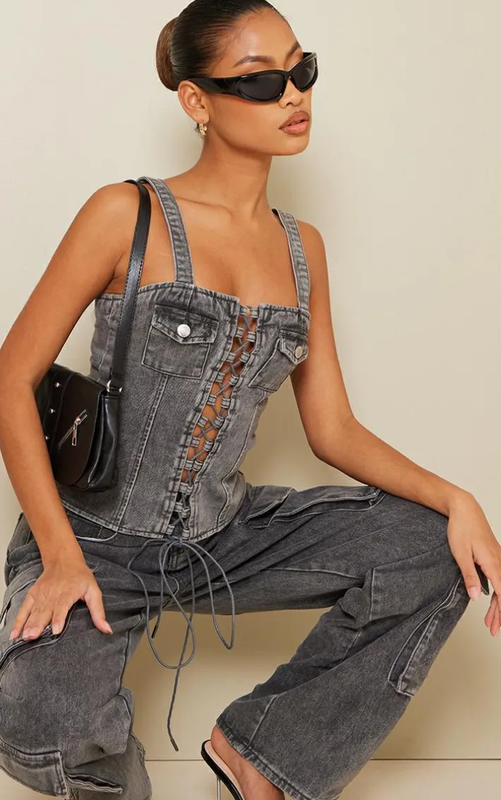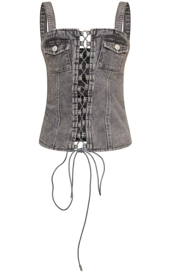 It’s time to take your style game to a whole new level with this top. Featuring a grey acid wash denim material with a lace-up style, we’re in love. Simply add the material denim bottoms, high heels and a black shoulder bag for a edgy combo.