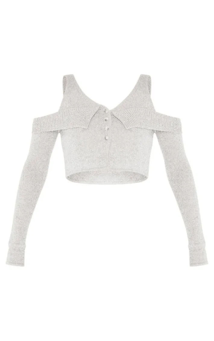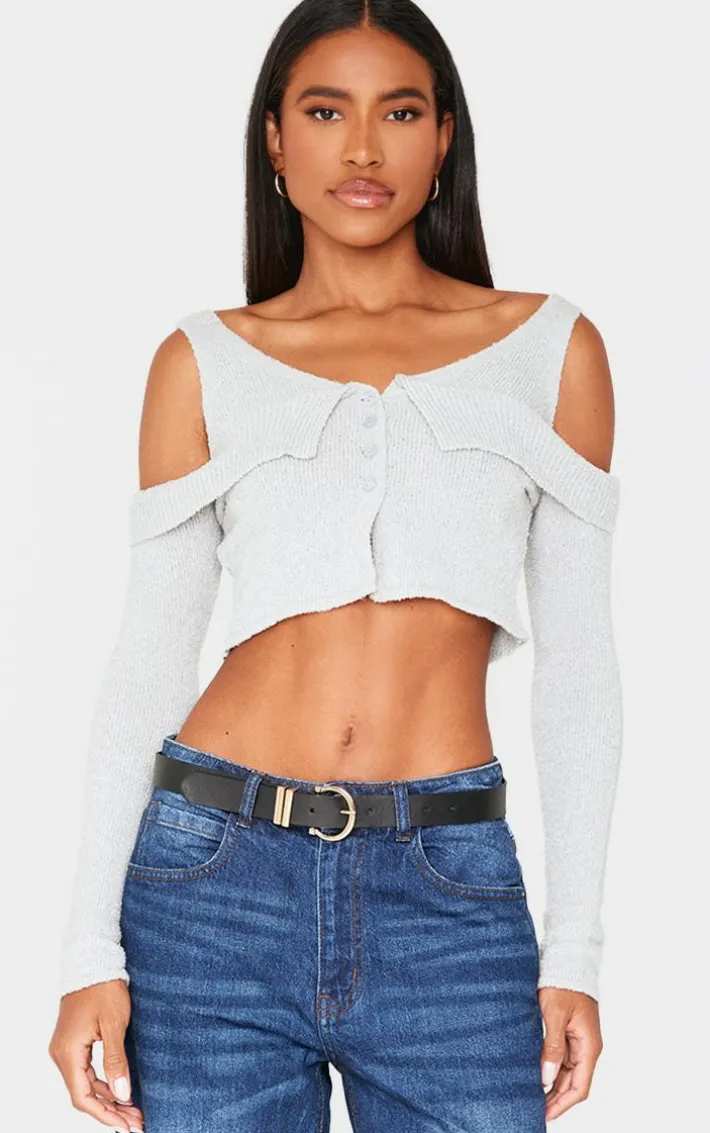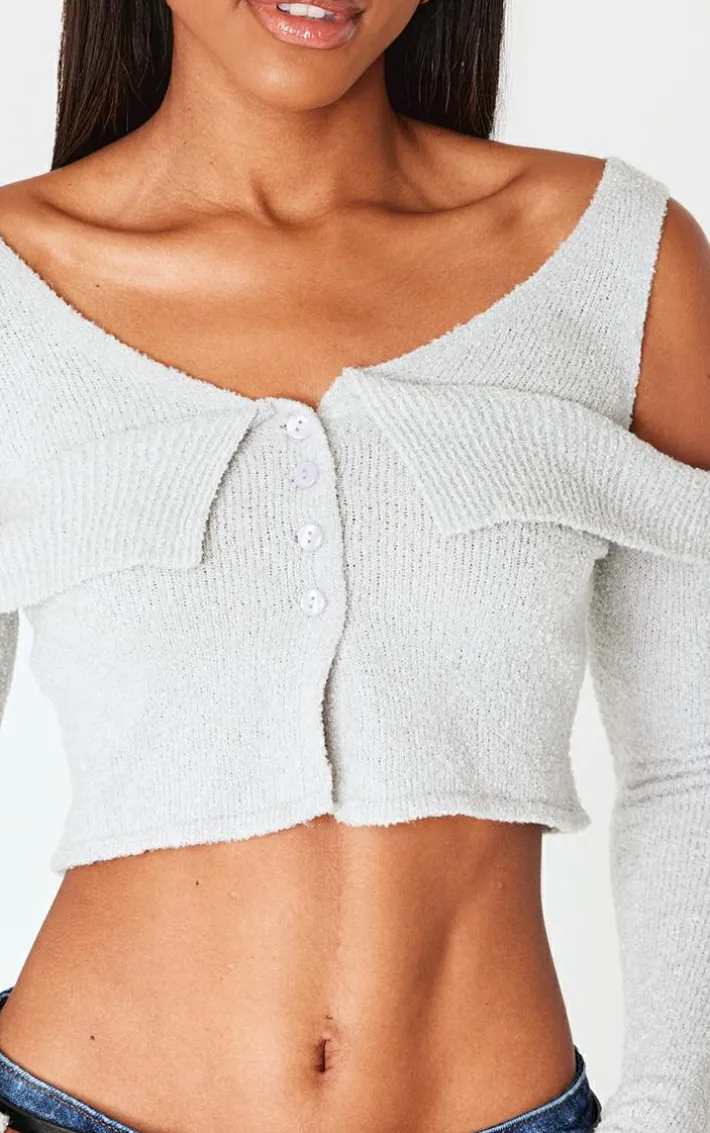 Look all kinds of chic in this grey boucle knit cold shoulder button up top. Brought to you in a grey hue boucle knit material with a cold shoulder design and button up fastening, this top is a must have. How can you resist? Style with jeans, fresh kicks and simple accessories to elevate the look. It’s a yes from us.
