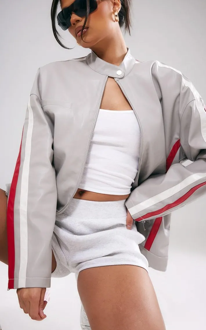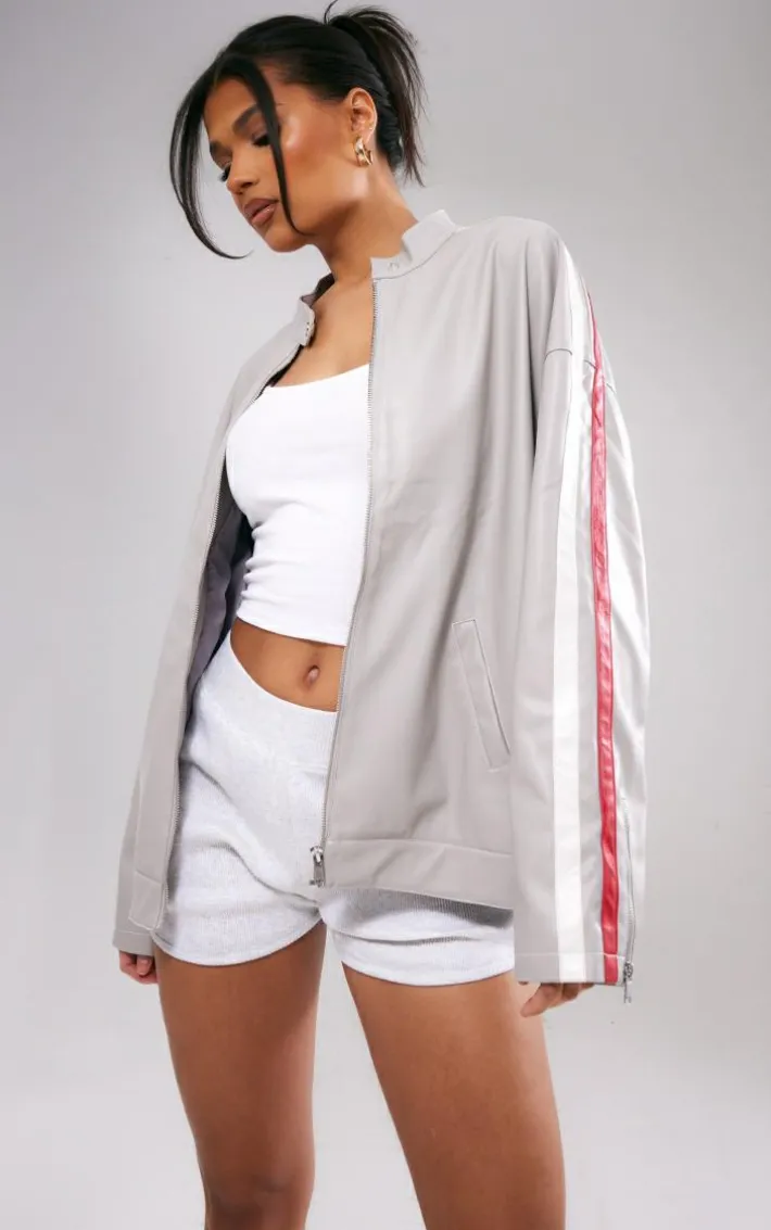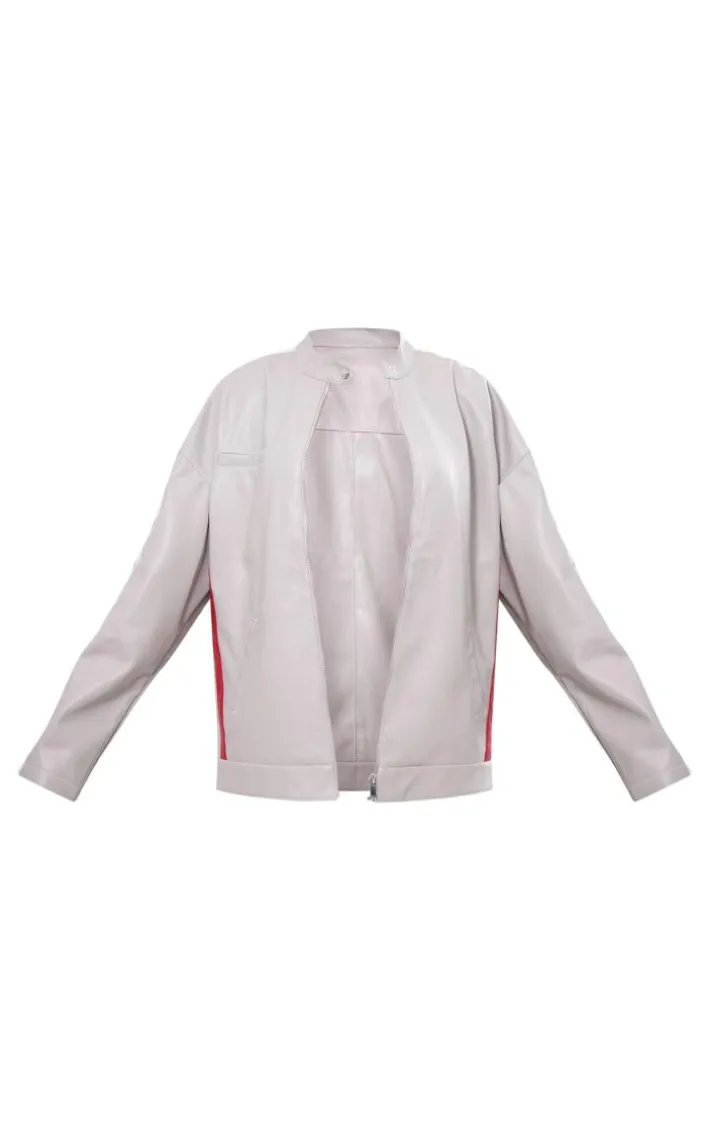 Take your off-duty style game to a whole new level with this grey faux leather stripe side oversized Biker jacket. Made from a grey faux leather material with side stripe detail and an oversized fit, how could you say no? This Biker jacket is the ultimate finishing touch to your outfit of the day and is sure to earn you some extra style points. Team with a basic all-white ‘fit and chunky sneakers for a vibe that won’t go unnoticed.