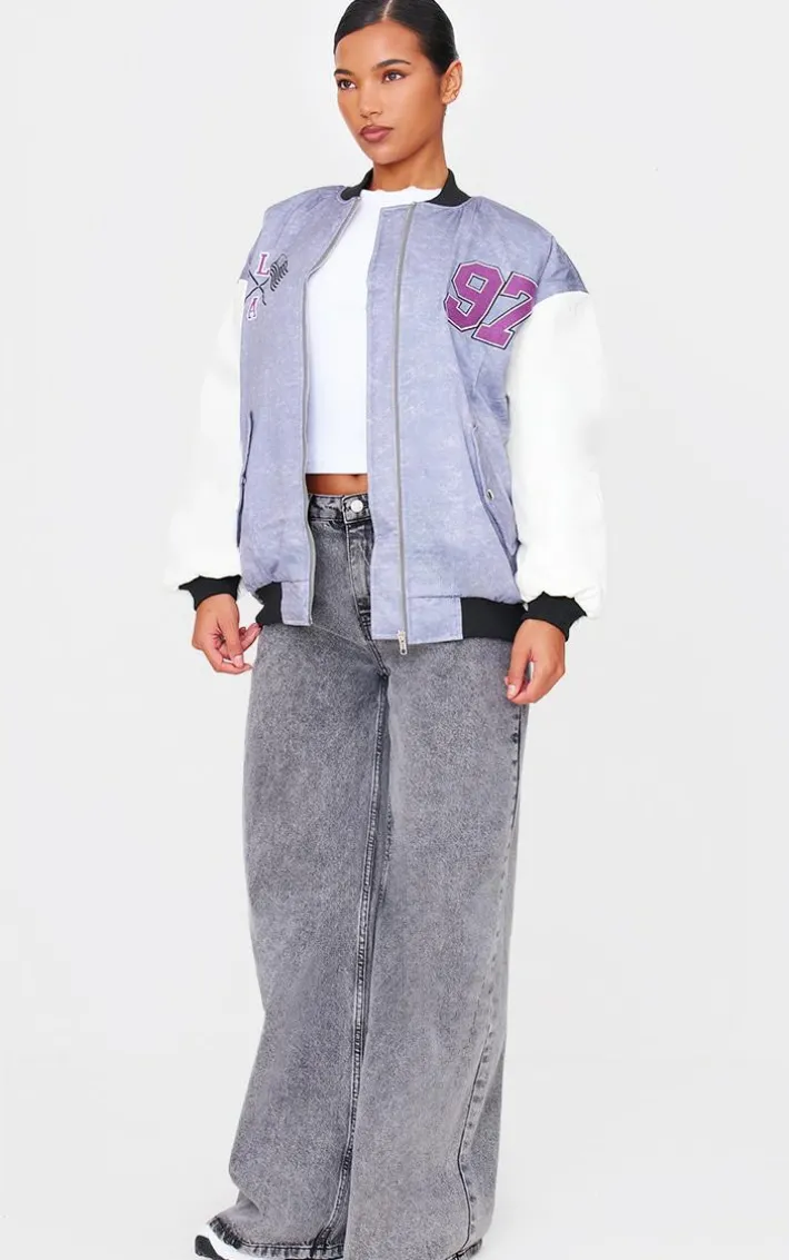 Bring all the edge to your outfit of the day with this grey Graphic detail oversized padded bomber jacket. brought to you in a grey material with a Graphic detail and an oversized fit, what more could you want? this padded bomber jacket is the perfect addition for those on the go days. Team with some wide leg jeans and a pair of sneakers for a fool proof finish.
