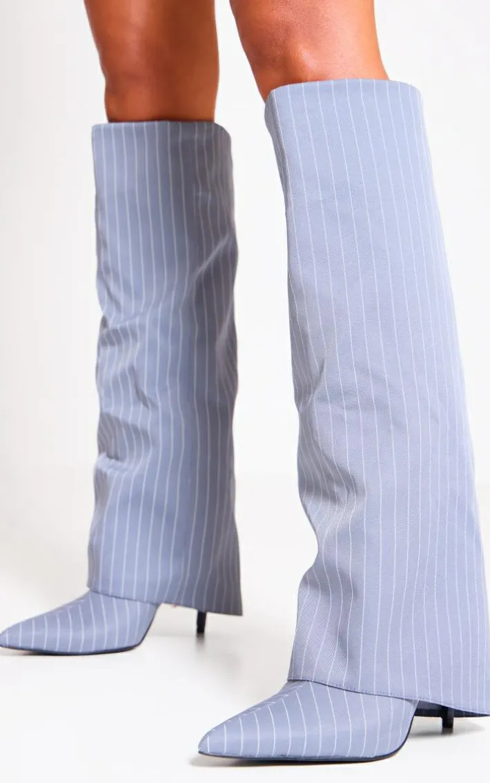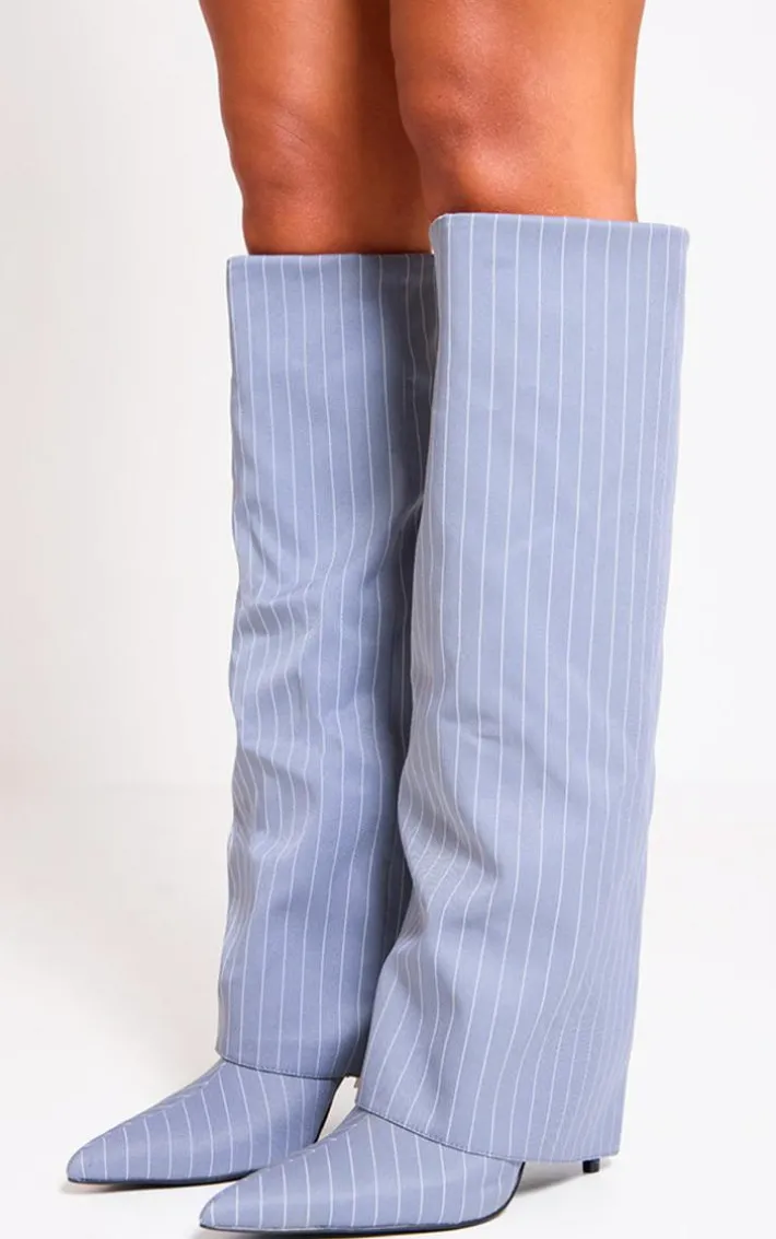 Make a statement in these grey pinstripe point toe fold over knee high stiletto heeled boots. Brought to you in a grey pinstripe material with a point toe design and a fold over knee high style, how can you say no? Style these heeled boots with your weekend outfit to take your look to a whole new level.