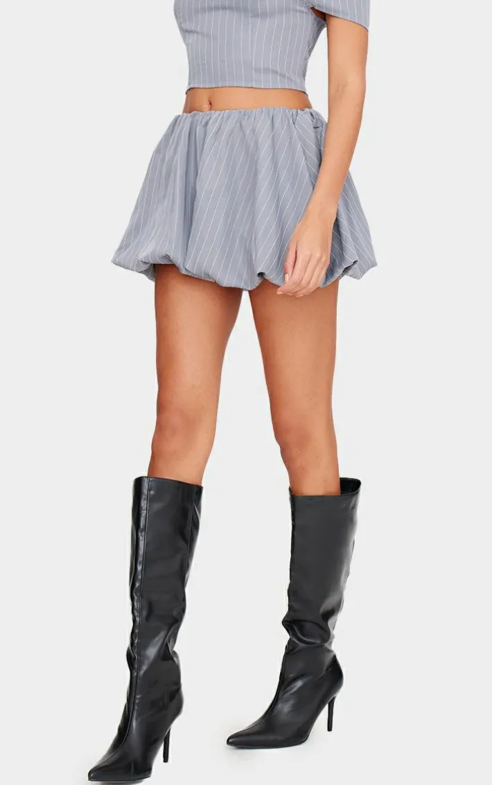 This grey pinstripe woven tailored puff ball skirt is all you need to keep it chic this season. Brought to you in a versatile grey shade, with a luxe pinstripe design, woven material and flattering tailored style, what’s not to love? Team with the matching pinstripe top and faux leather boots for a look that won’t go unnoticed.