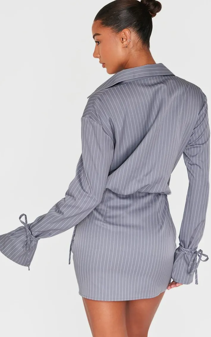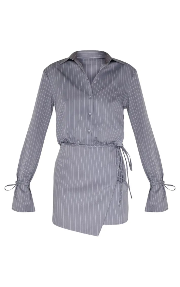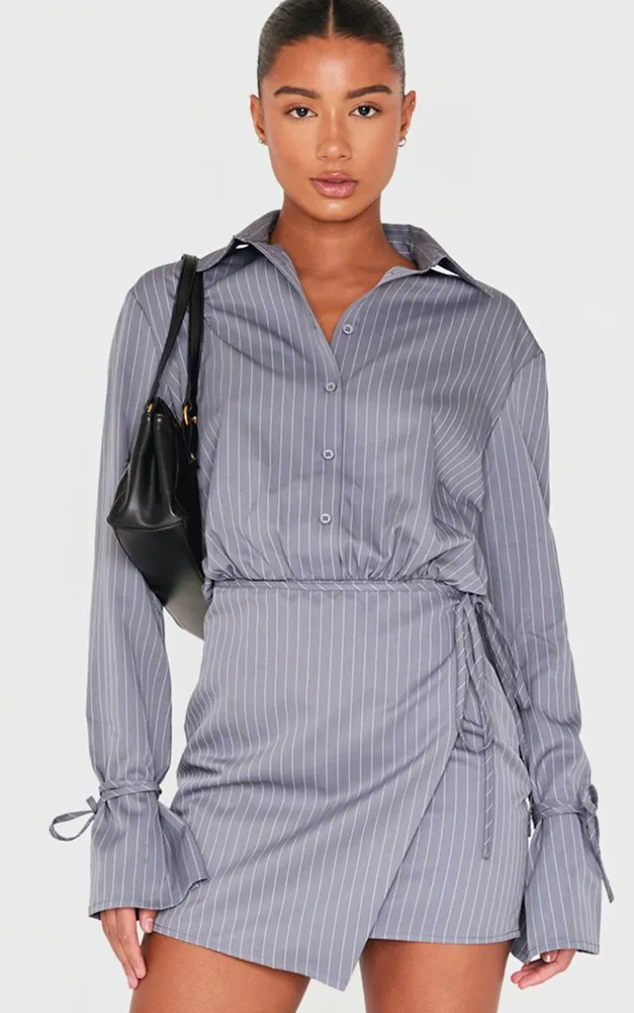 Introducing this grey pinstripe wrap shift dress for your new season wardrobe. Brought to you in a grey hue material with a pinstripe design and wrap detail, this shift dress is all the new you need. Style with some chunky loafers and a black mini bag for a chic finish we’re loving.