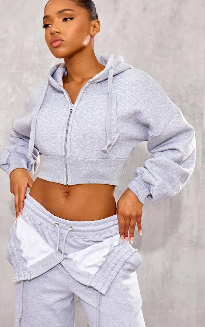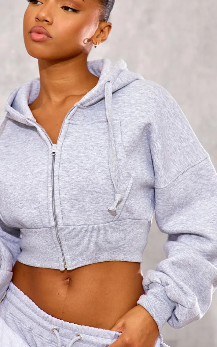 You can never have too many comfy pieces and we are loving this grey zip up pocket detail cropped hoodie for your new season wardrobe. Made from a grey material with a zip up fastening, pocket detailing and a cropped fit, what’s not to love? Style this cropped hoodie with matching sweatpants, fresh sneakers and gold accessories for a look that is perfect for those on-the-go days.
