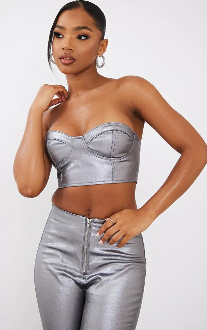 Turn heads for all the right reasons in this dreamy top. Featuring a gunmetal metallic denim coated material in a bandeau style, we’re obsessed. Wear with the matching bottoms, high heels and statement accessories for a next level look.