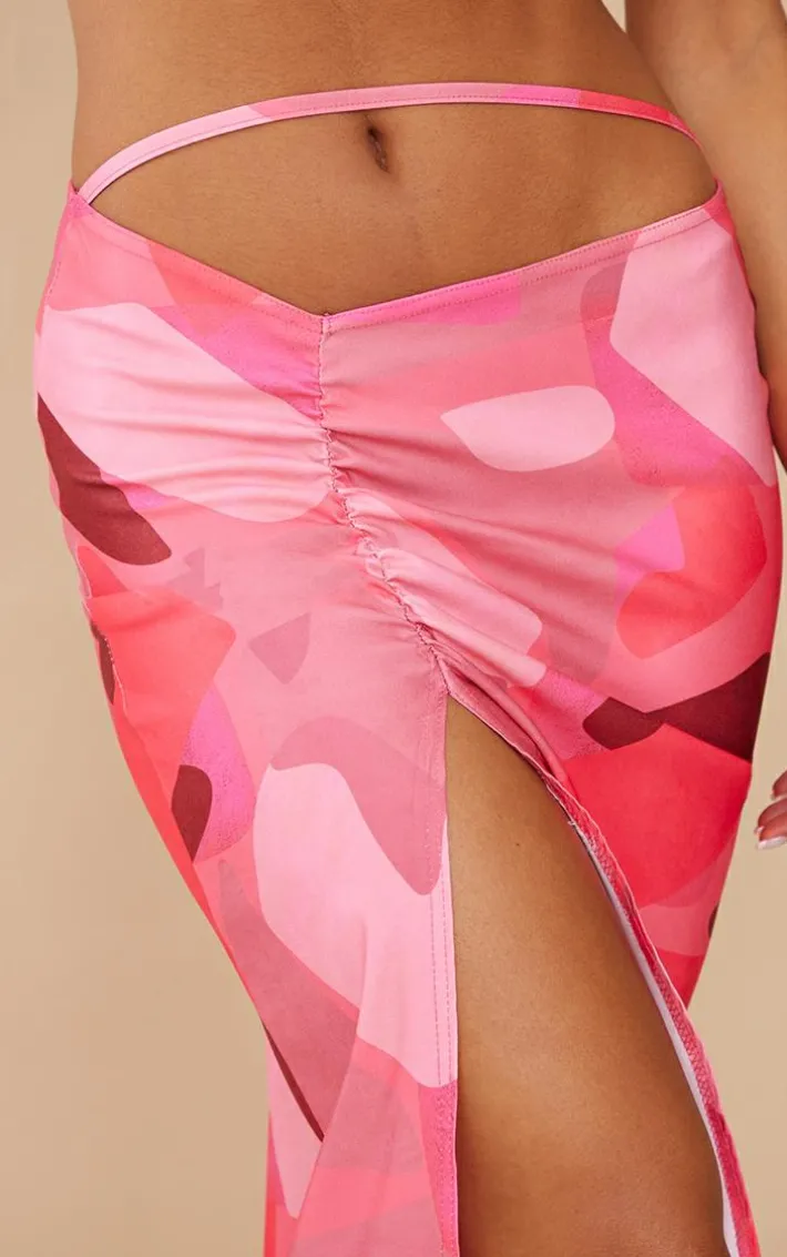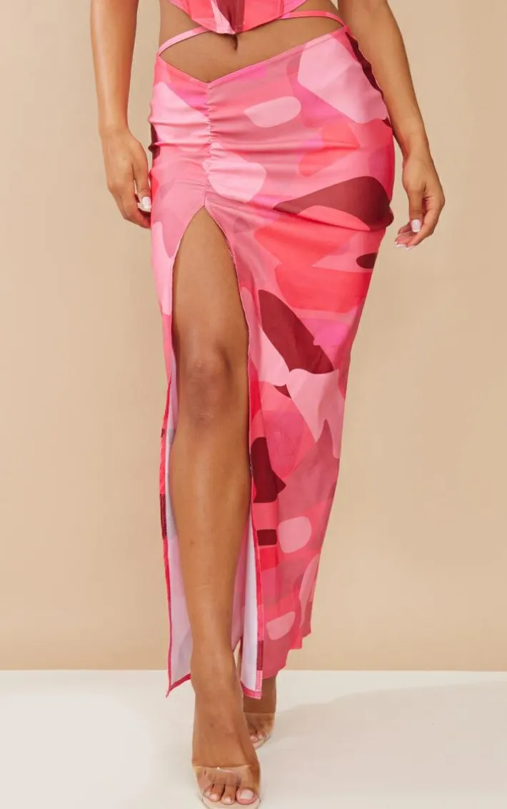 We’re obsessed with this hot pink abstract printed split maxi skirt for your weekend ‘fit. Its pink abstract printed material will make you stand out from the crowd whilst its split hem shows off your unreal figure. This maxi skirt is a must-have for your next vacay or catch-up. Add all the glam vibes to your look with the matching top, clear heels and a clutch bag. It’s a yes from us.