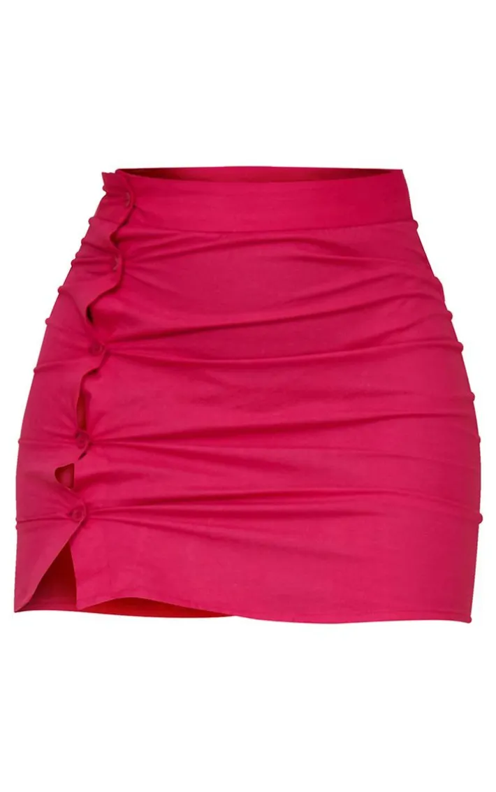 We are loving this skirt for your new season wardrobe. Featuring a hot pink material with an asymmetric button up design and a mini fit. Style with the matching shirt, a bralet and tie up heels for a fierce weekend-worthy fit.