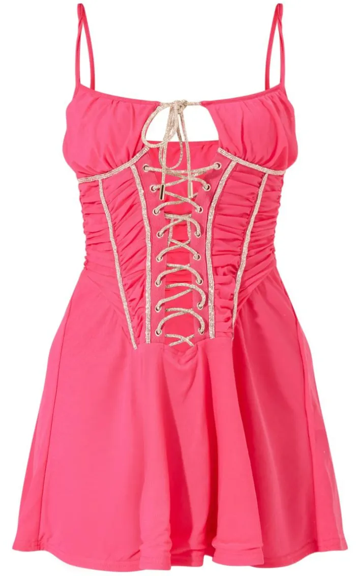 Turn heads and be the topic of everyone’s conversation with this statement hot pink diamante rope lace up mesh ruched bodycon dress. This bodycon dress is brought to you in a hot pink material with a diamante rope design and ruched detailing, what’s not to love? This bodycon dress is everything and more we’re loving paired with high heels and accessories for a look like no other.