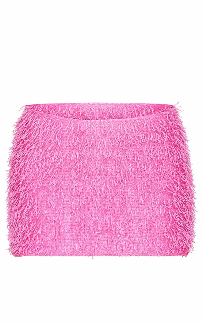 Add a pop of pink to your weekend wardrobe with this hot pink eyelash tinsel detail mini skirt. Brought to you in a hot pink eyelash material with tinsel detailing and a mini fit, how can you resist? Style this mini skirt with a long sleeve top and heels for a look that won’t go unnoticed this weekend.