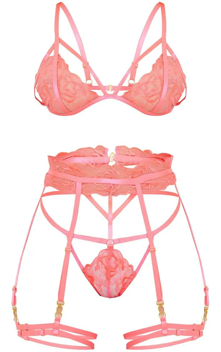 Give your lingerie collection a bright update with this 3 piece set. Featuring a bra with harness detailing, suspender belt and matching thong, all in a hot pink lace material with floral embroidery detailing, what’s not to love? Wear solo for a look that will have hearts racing.