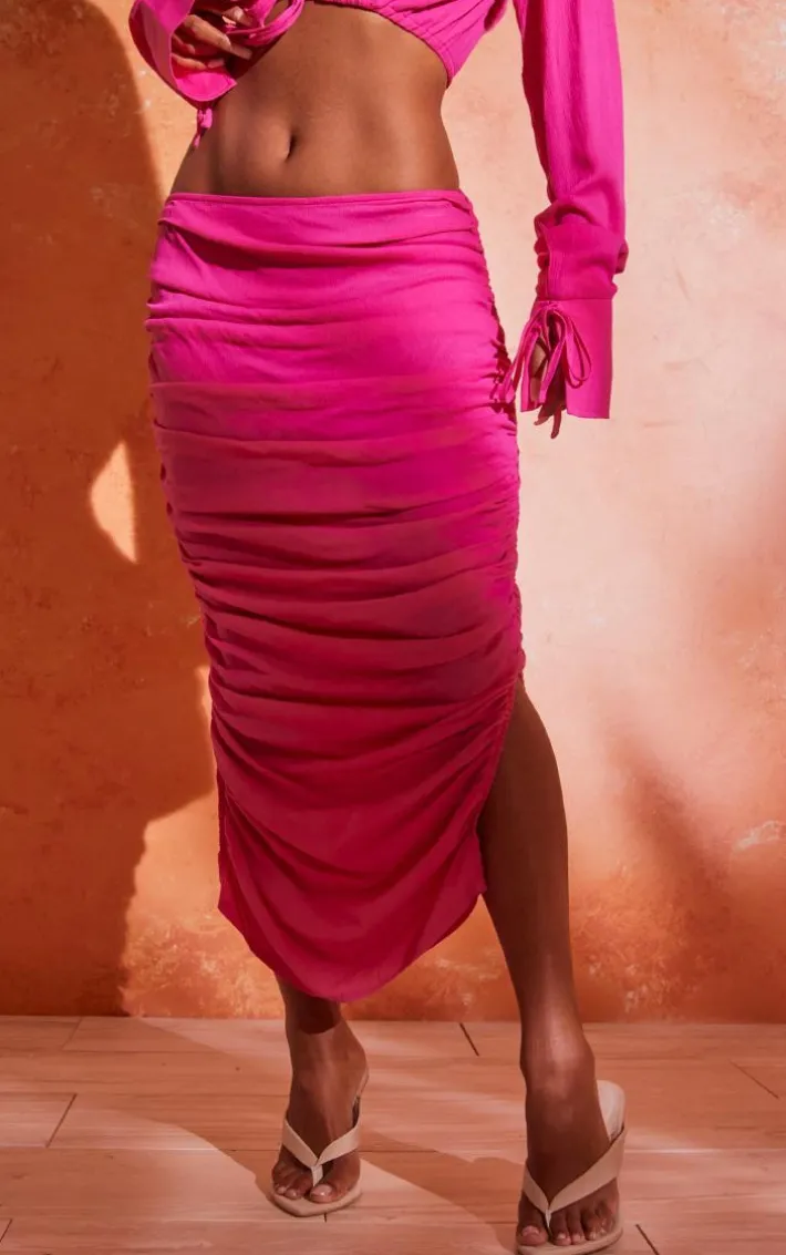 When the weekend calls for a little drama this hot pink mid rise ruched midaxi skirt is sure to be your new go to. Its hot pink material is sure to make you stand out from the crowd while the ruched detailing will have you nailing major trends. This dreamy mid rise skirt is sure to show off your unreal shape, what’s not to love? Pair with the matching top, slip-on heels and your fave accessories for a statement finish.