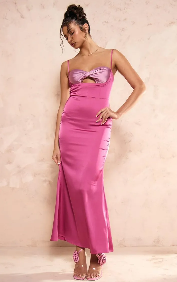 Stand out from the crowd for all the right reasons in this hot pink satin contrast twist cup midaxi dress. Brought to you in a hot pink hue satin material with a contrasting twist cup design and a figure-worshipping midaxi fit, how can you not fall in love? Style this satin dress with your highest heels and some glam accessories to bring the look together.