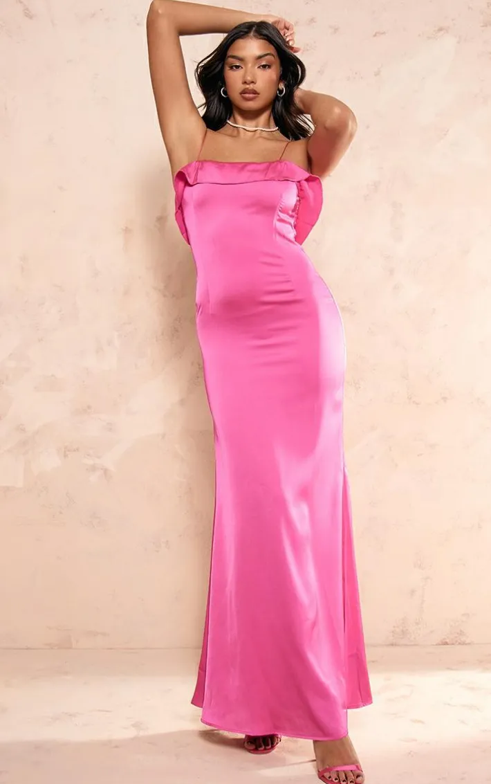 Dare to stand out from the crowd in this statement hot pink satin draped frill back detail maxi dress. With a hot pink satin material, frill back detailing and a maxi length, this dress is perfect for your next upcoming occasion. Style with your highest heels and simple accessories for a look that will bring all the glam vibes.