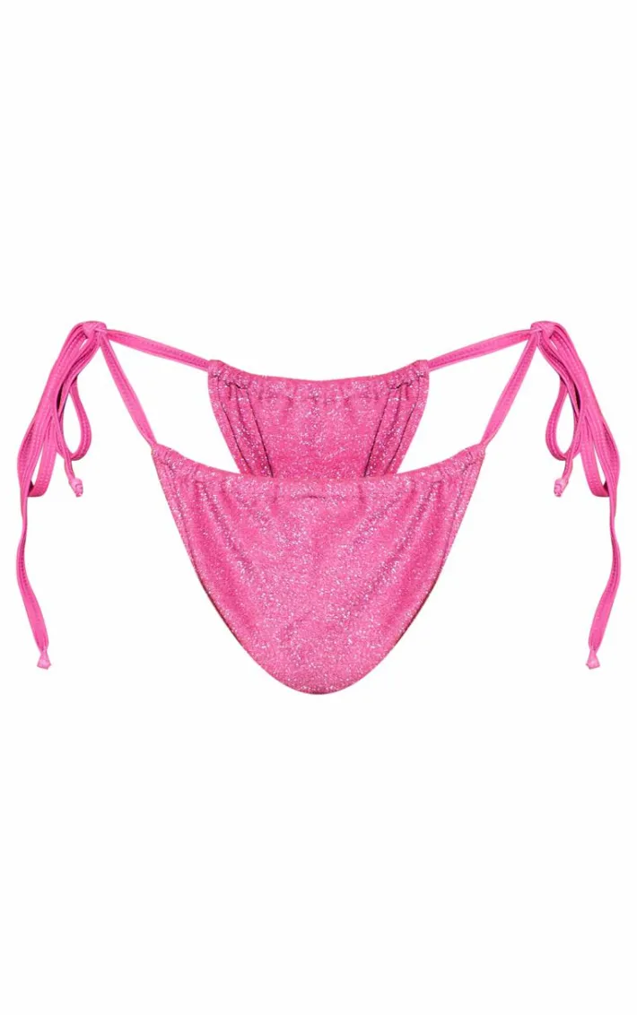 Don’t forget to pack these hot pink tie side glitter bikini bottoms into your suitcase, we’re seriously obsessed. These bikini bottoms are made from a hot pink glitter material with a tie side, how could you not be in love? Just add the matching bikini top and your fave accessories for a look everyone will want.