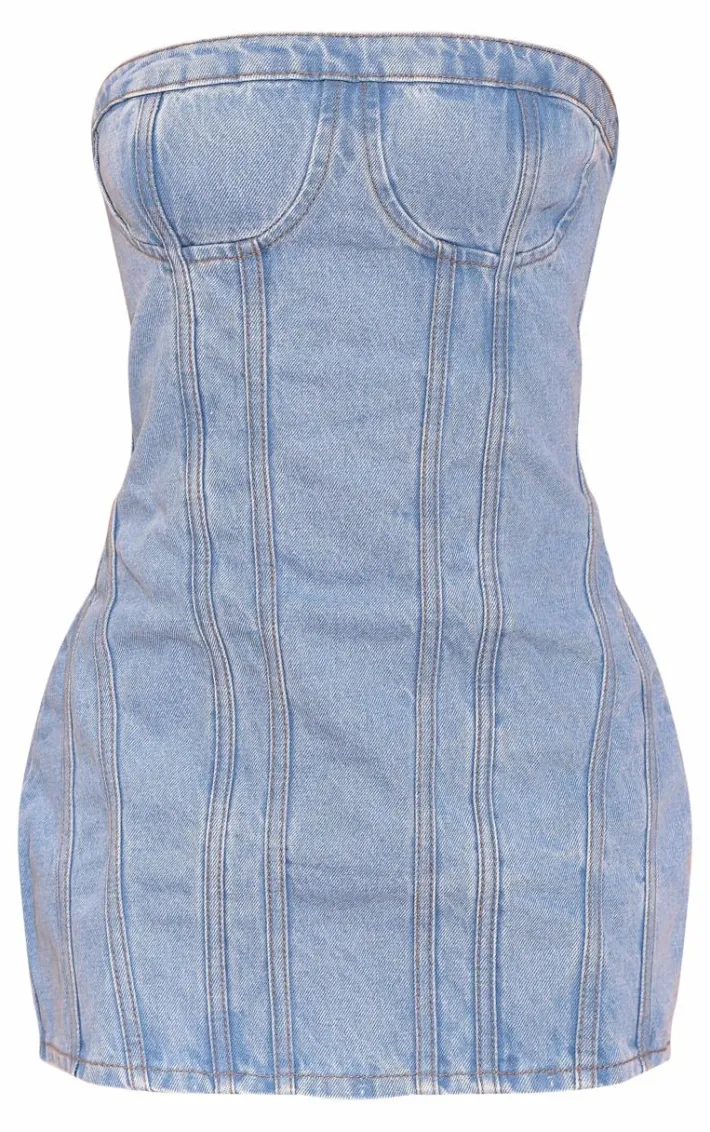 Take your new season wardrobe that extra mile with this ice blue strapless corset seam denim bodycon dress, you won’t be able to resist. This dress is made using an ice blue denim material with a strapless style and a corset design that will show off your unreal shape, what more could you want? Pair with heels and your fave accessories to elevate the look further.
