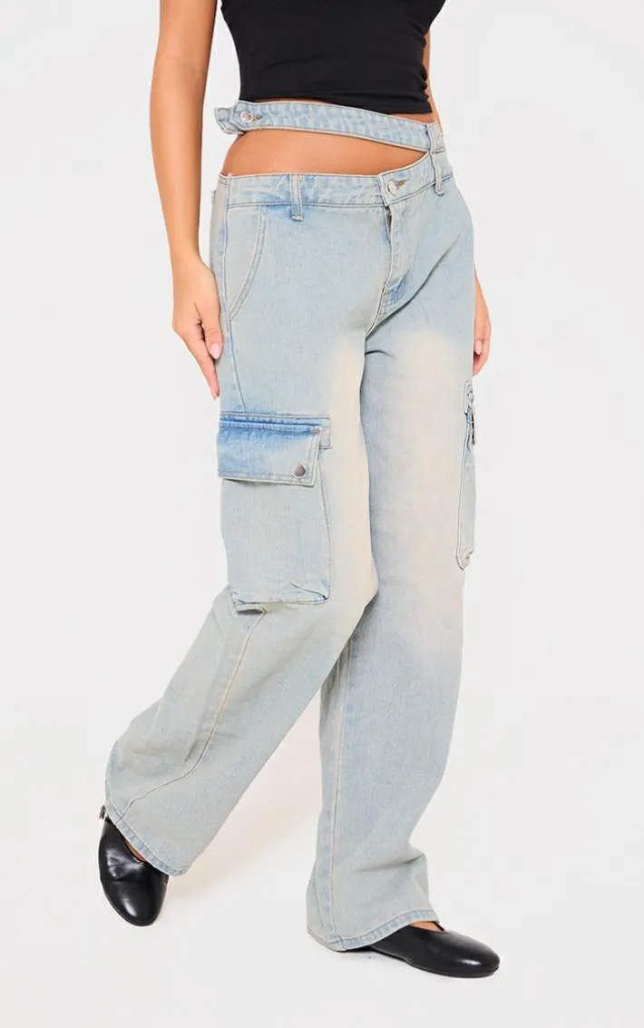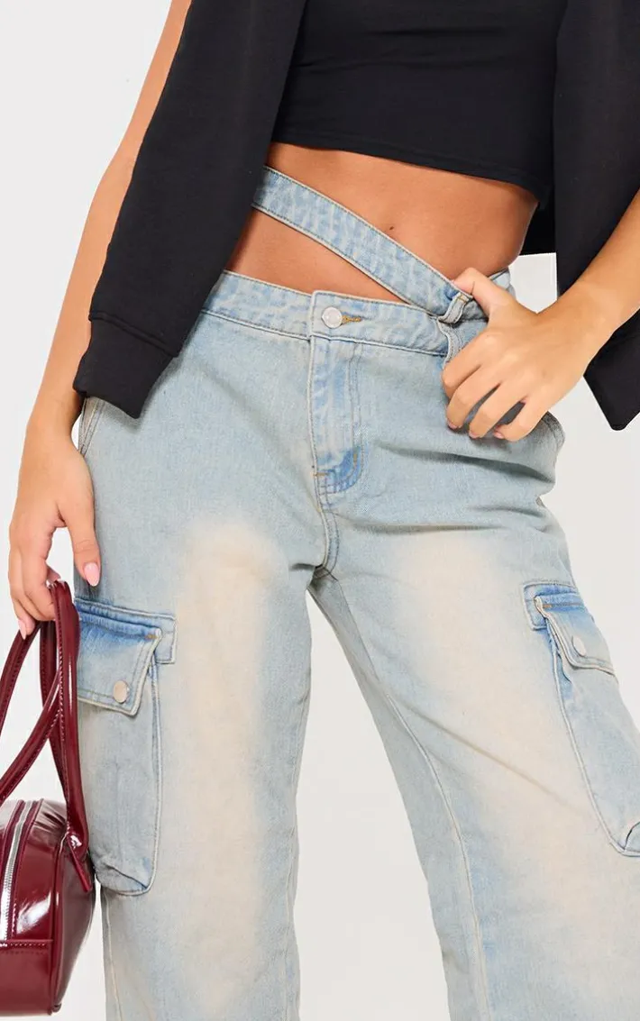 We are obsessing over these ice blue washed cut out waistband pocket detail jeans, and they are perfect for your new season wardrobe. Brought to you in an ice blue washed material with a cut out waistband adding all the edge to your look. Its pocket detail is all you need to stand out from the rest. Team with a crop top and a pair of court heels to elevate the look to new heights.