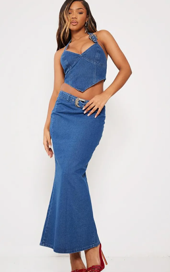 When the weekend calls so does this indigo buckle detail halterneck crop denim top. Made from an indigo denim material with a halter neckline and buckle detail, what’s not to love? Super easy to style, this corset top will be that one piece you keep reaching for. Get that weekend-worthy finish with the matching maxi skirt, bold hue heels and a shoulder bag.