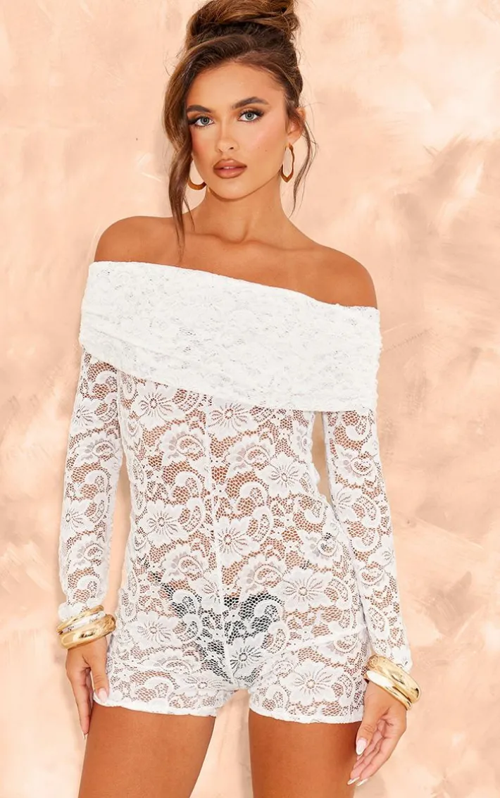 Make a statement this season in this ivory lace bardot romper. Brought to you in an ivory lace material with a bardot neckline, this romper is unreal. What more could you want ? Style with white heels and gold hoops for a look that will steal all the stares. It’s official, we’re obsessed