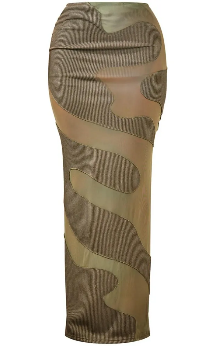 Turn heads for all the right reasons this weekend with this khaki abstract mesh panel maxi skirt. Made from a khaki hue material with mesh panel details and a figure-flattering fit, how could you say no? Perfect for your upcoming weekend plans and nailing the dress code, this maxi skirt is sure to gain all the compliments. Team with the matching crop top, court heels and gold accessories for a look that we’re obsessed with.