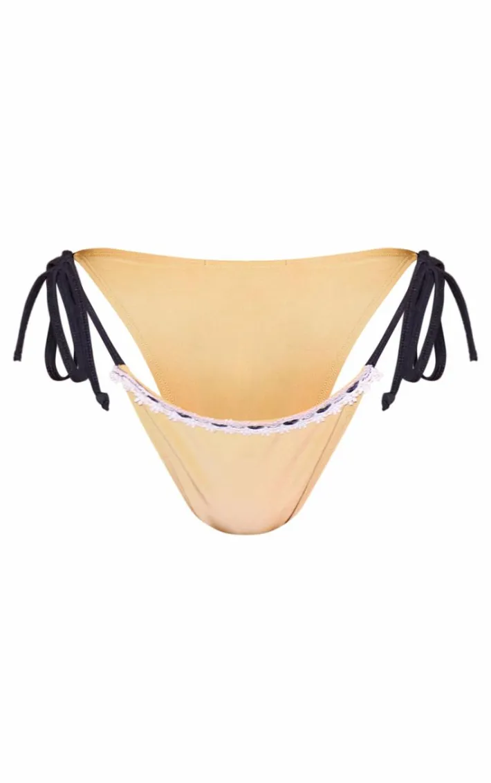Get your tan on this vacay season with this khaki contrast lace edge tie side bikini bottoms. Brought to you in a khaki contrast material with a lace edge detail and tie side fastening, these bikini bottoms are a must-have. Style with the matching top and pool-side sandals to get your glow on.