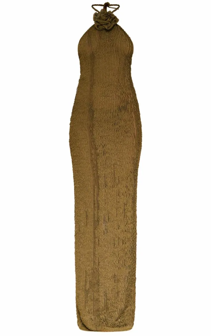 Take on your weekend the right way with this statement khaki corsage detail halterneck midaxi dress. Made from a khaki material with a corsage detail and a halterneck design, this is everything we’re loving and more. With It’s figure-hugging fit this midaxi dress is sure to hug you in all the right places. To complete the look style this seamlessly with high heels and accessories for a look that will secure you all the likes.