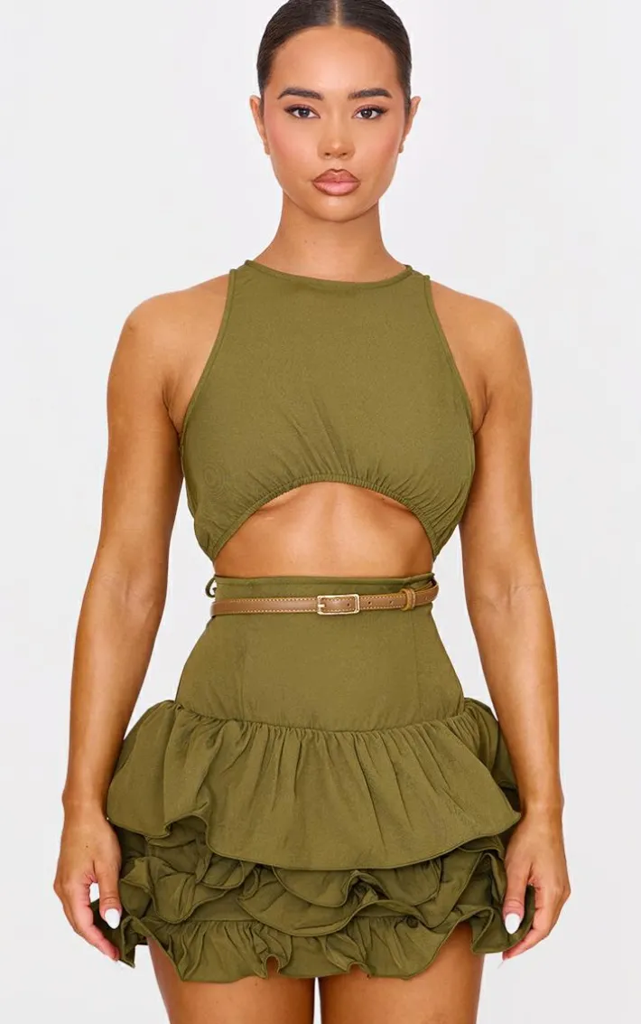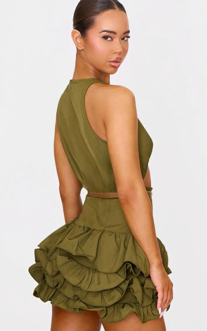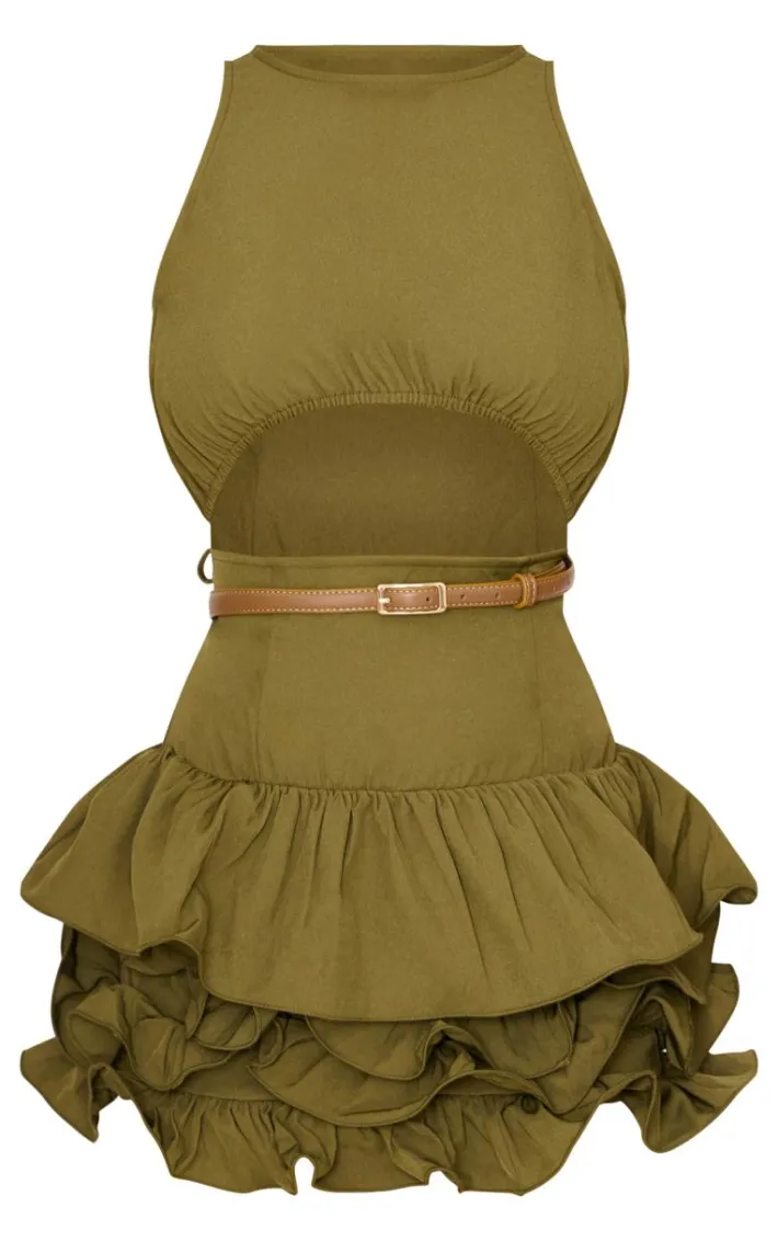 When the weekend calls so does this khaki cut out belted frill hem mini dress. Brought to you in a khaki hue material with a cut out design and belted detail, this frill hem mini dress is everything you need and more. Style with some heeled boots and gold accessories for a glam finish we can’t stop staring at.