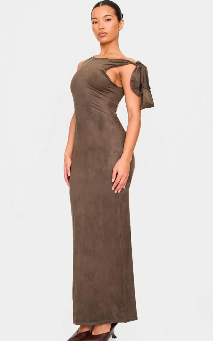 Take the stress out of weekend styling with this khaki faux suede knot drape maxi dress. Brought to you in a khaki hue faux suede material with a knot drape detailing and a flattering maxi fit, how can you resist? Style this maxi dress with heels and gold accessories for a look that is sure to turn heads.