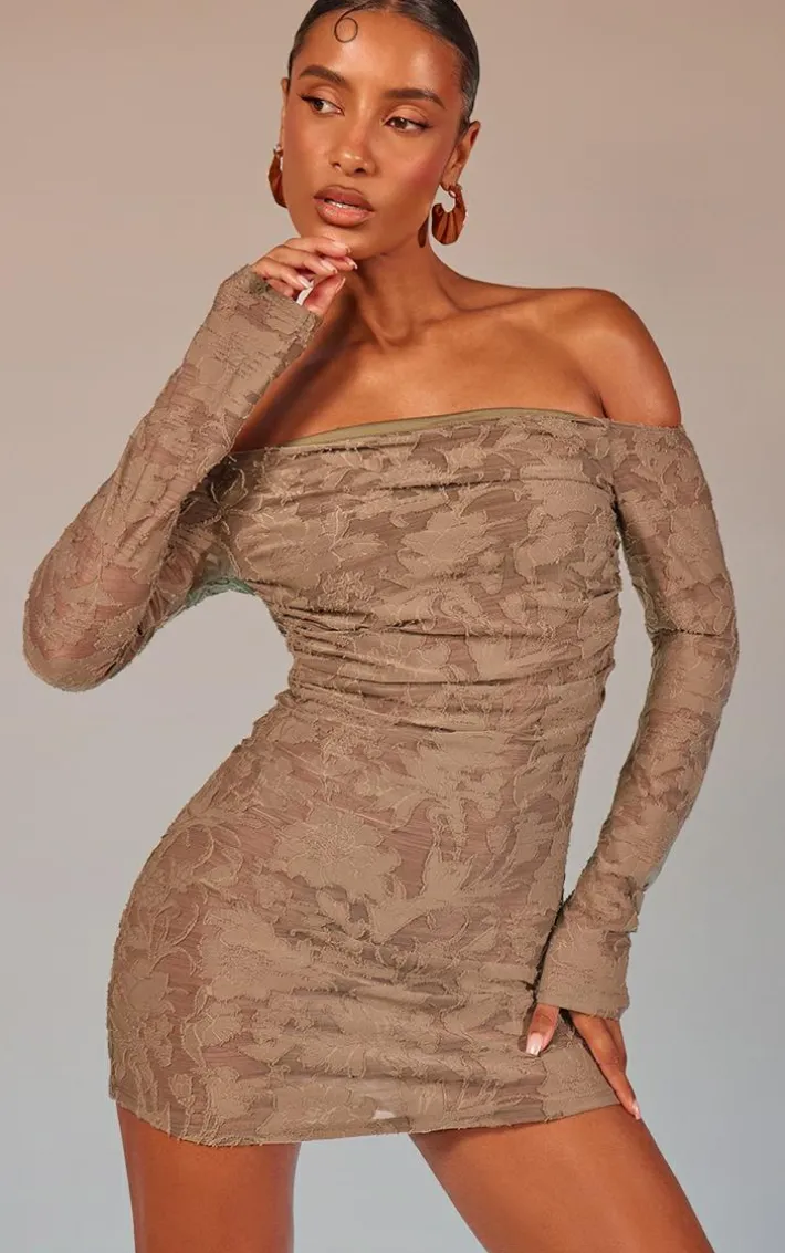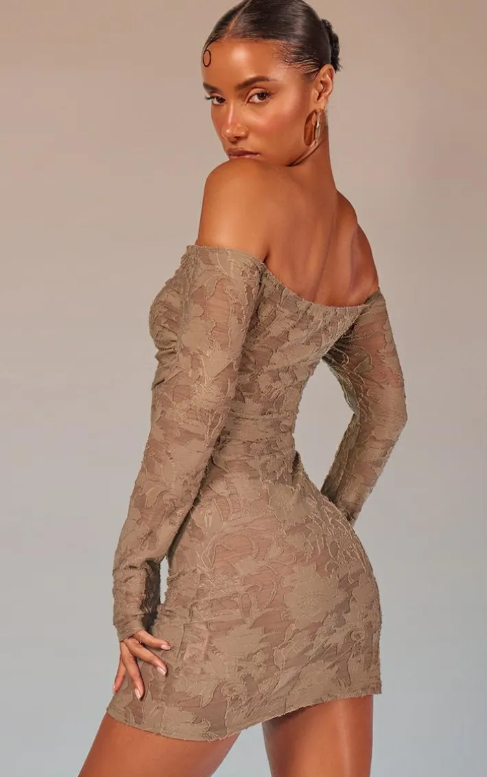 Create a look no one will forget with this khaki floral sheer burnout bardot bodycon dress. Brought to you in a khaki floral sheer material with a bardot design and a figure-hugging fit, this bodycon dress will have you standing out from the rest. Style with your dreamy high heels and accessories for a combo we can’tstop crushing on.