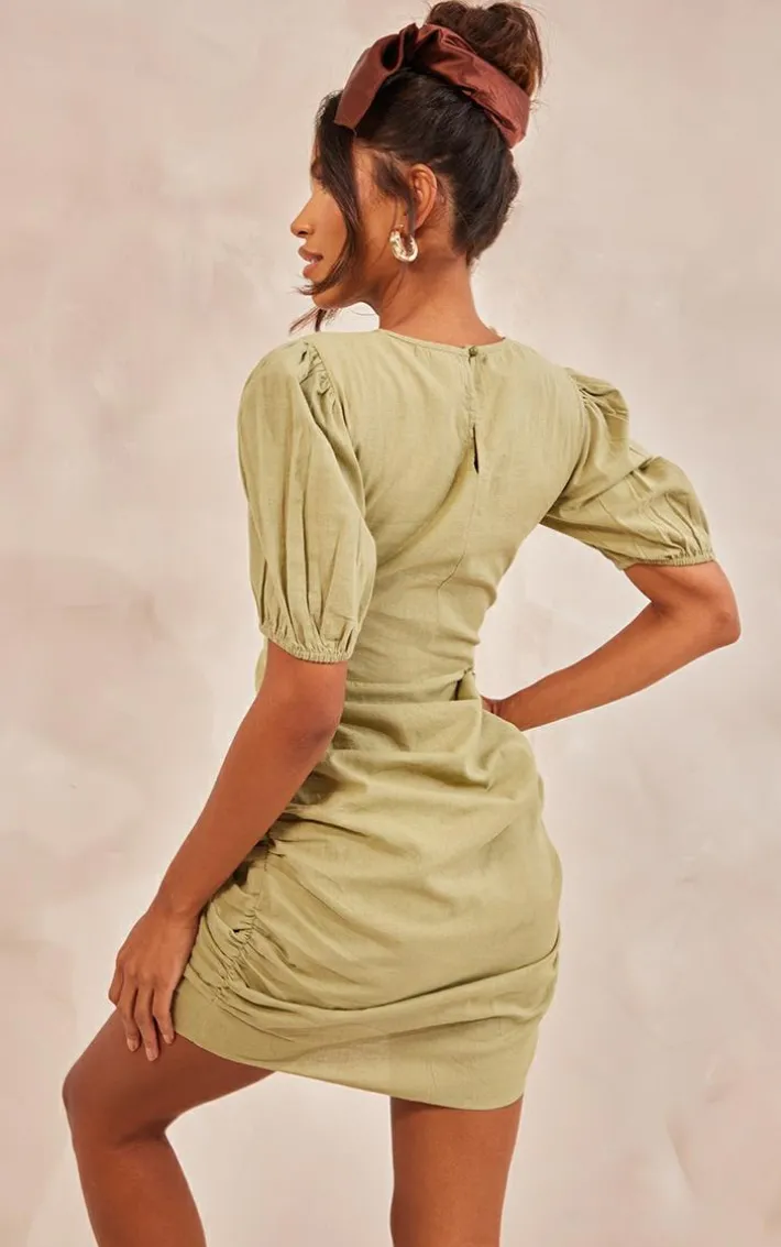Say hello to this season’s newest must-have with this khaki linen scoop neck ruched skirt bodycon dress. Its khaki linen material adds a luxe touch to your look whilst its ruched skirt is super flattering. This bodycon dress is sure to become your new go-to for any occasion and can be dressed up or down. For a dreamy off-duty look, add staple sandals and gold accessories.