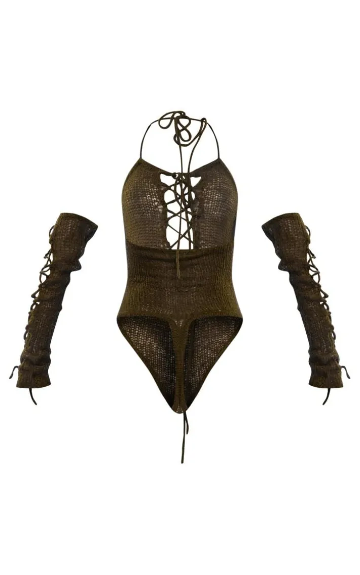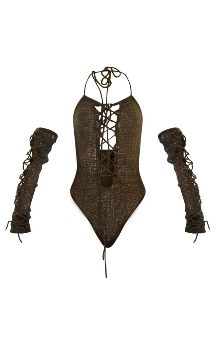 When your weekend look calls for a little touch of drama, this khaki open knit lace up bodysuit and sleeves is sure to make you stand out from the crowd. Made from a khaki hue open knit material with a lace up design and matching sleeves, how can you resist? Style this bodysuit with a flattering midaxi skirt, clear strap heels ad statement accessories for a look that will get you noticed.