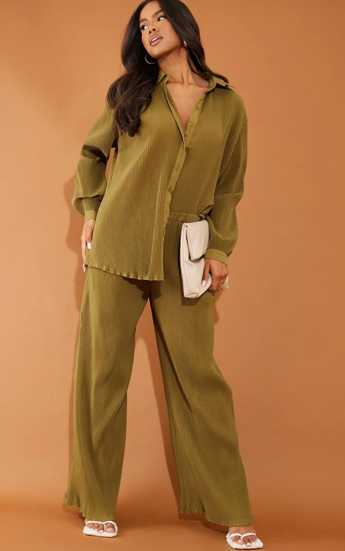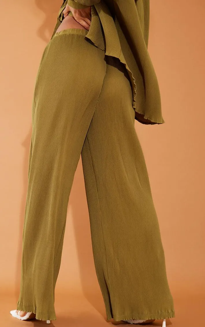 These bottoms are perfect for you. Featuring a khaki plisse material with a high waist and wide leg bottoms, how could you say no? Wear with the matching shirt and your highest heels to make heads turn.
