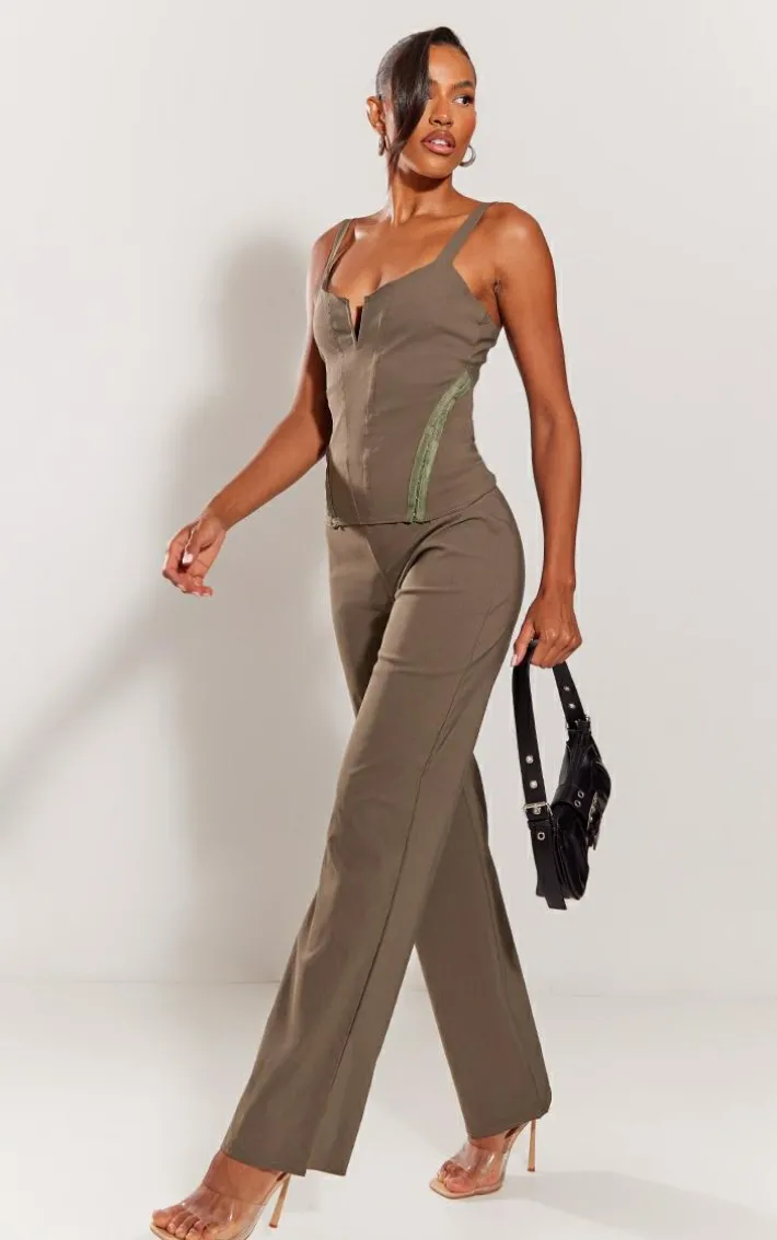 We’re in love with these khaki stretch woven low rise straight leg pants for your new season wardrobe doll. Made from a khaki stretch woven material with a low-rise waist and a straight-leg fit, how could you say no? These pants will level up any look and give you that seriously luxe touch. All you need to add is the matching corset top, clear heels and a shoulder bag to seal the seriously glam vibe.