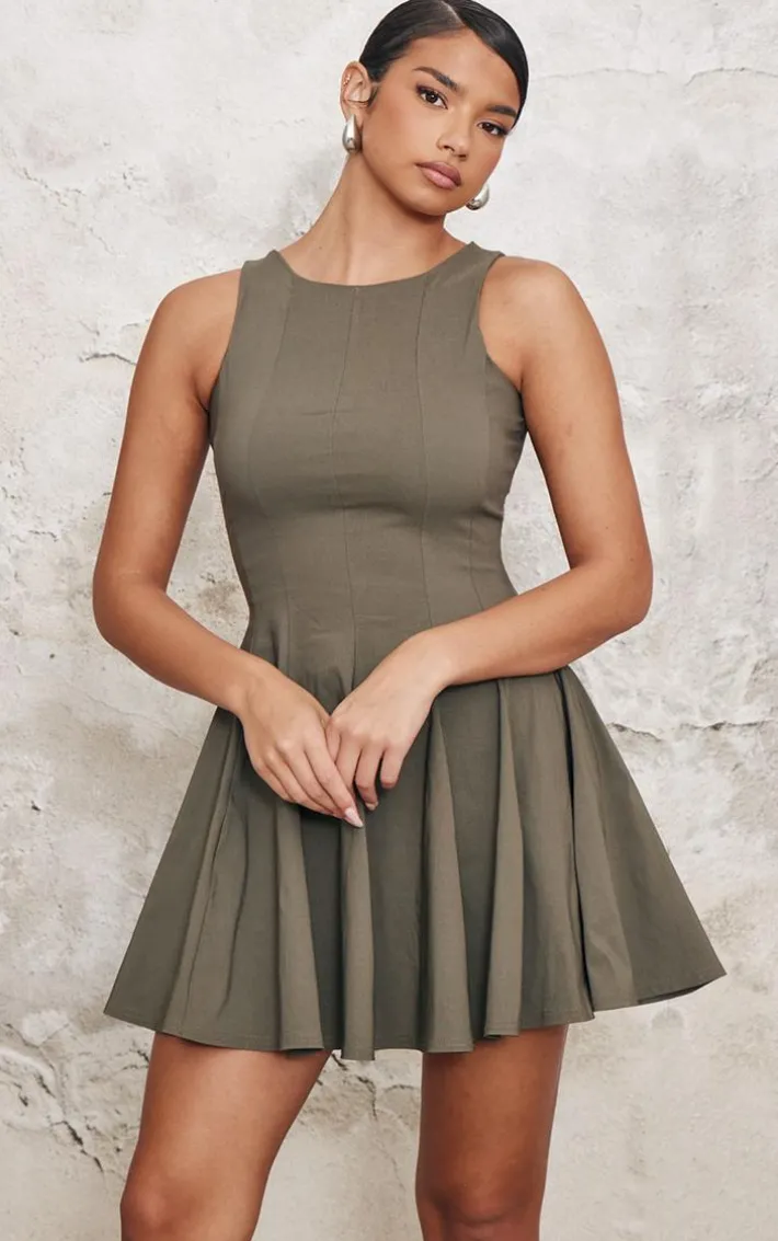 Take the stress out of weekend styling with this khaki stretch woven racer pleated shift dress. Brought to you in a khaki stretch woven material with a racer neckline and a pleated design, what’s not to love? Style this shift dress with chunky boots and gold accessories for a look that is sure to make heads turn wherever you go.