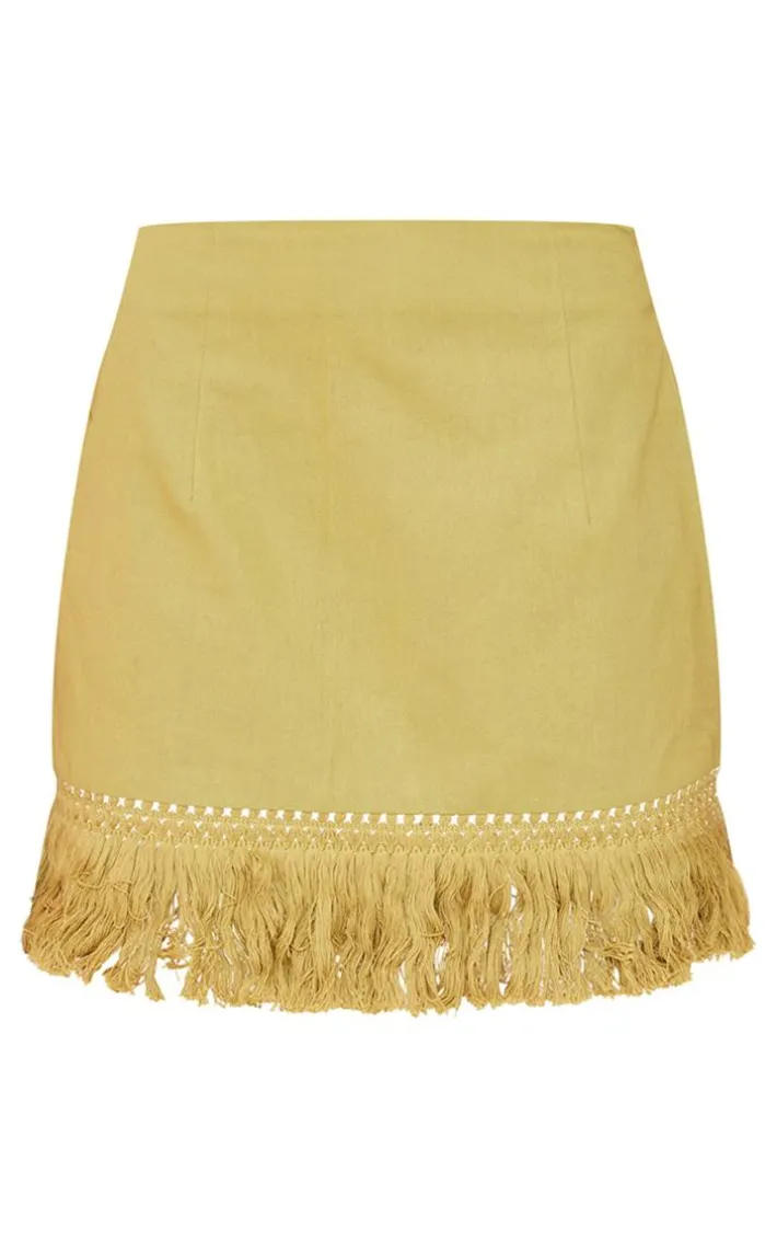 Your new season wardrobe is calling out for this khaki tassel fringe hem detail mini skirt. This skirt is made from a khaki material with a tassel fringe hem detail, what’s not to love? With a mini length, this unreal skirt is sure to have heads turning for all the right reasons. Team with a cropped tee and some chunky sandals, its a yes from us.