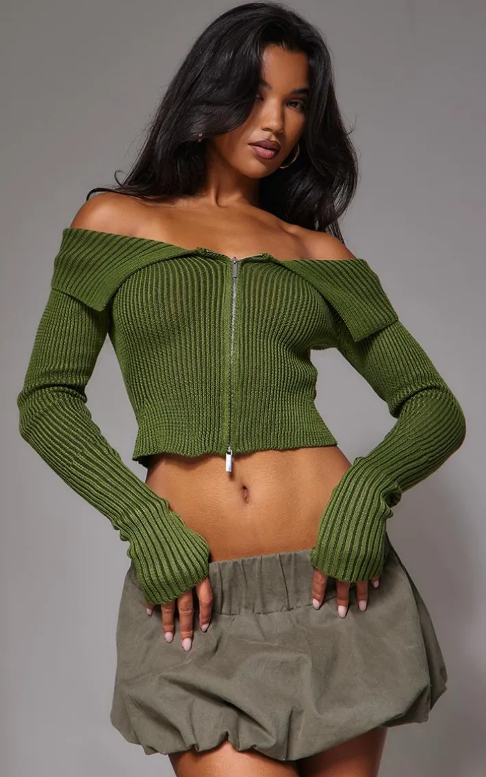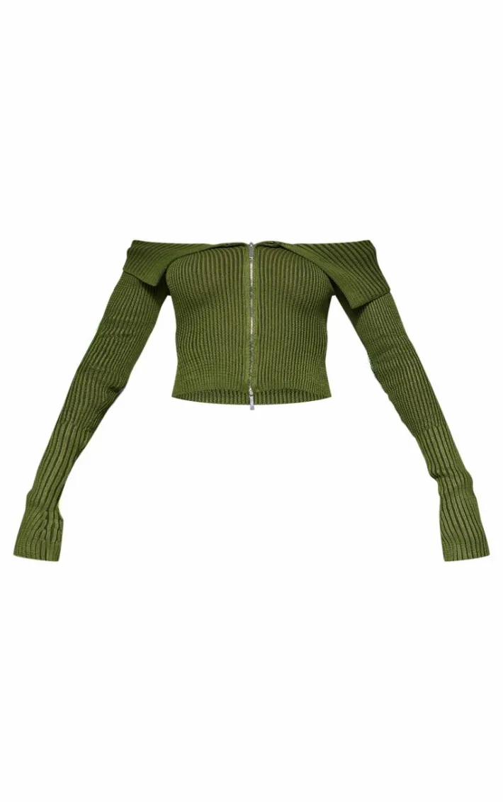 Bring all the cosy feels to your weekend look with this khaki thick rib knit foldover zip up bardot top. Made from a khaki thick rib knit material with a foldover bardot design and a zip up front fastening, how can you resist? Style this knit top with a mini skirt, heels and gold hoops for a look that will steal all the stares.