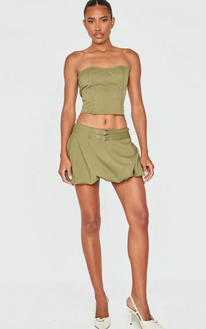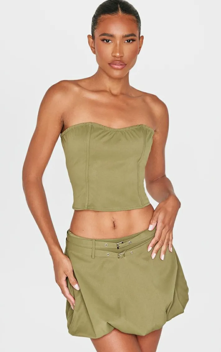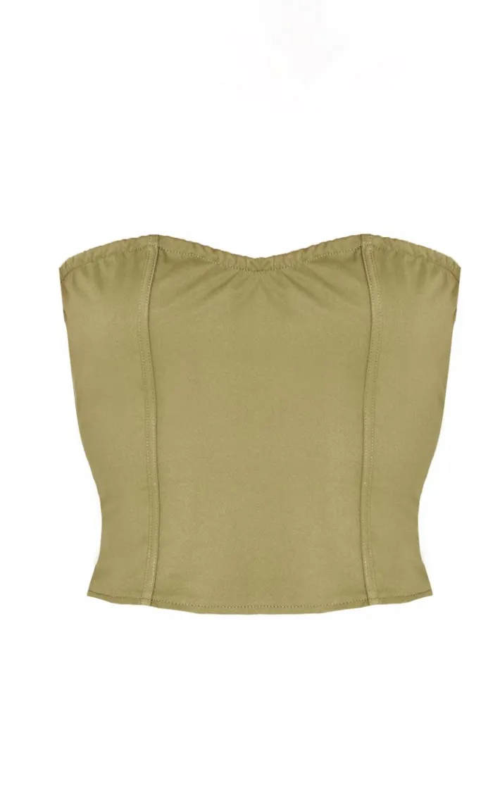 This khaki twill buckle detail bandeau corset top is just what your off-duty wardrobe is calling out for. Made with a khaki twill fabric, buckle detailing and bandeau corset fit, it’s made for your weekend plans. Just addthe matching khaki mini skirt, heels and a faux leather bag to keep it chilled.