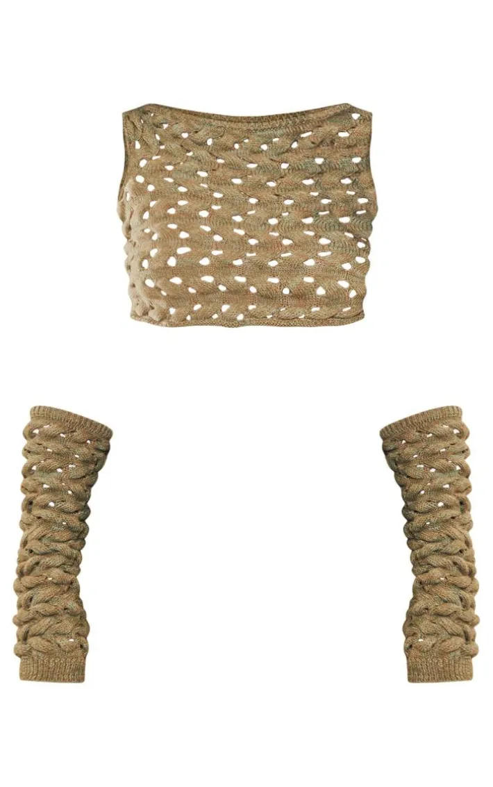 Add some attitude to your new season wardrobe with this khaki twist knit cut out racer top and sleeves. Brought to you in a khaki hue twist knit material with a racer neck design and matching sleeves, what more could you want? We are loving this crochet top styled with the matching skirt for a fierce weekend-worthy look. Just add chunky boots, statement accessories and an oversized faux leather jacket to elevate the look.