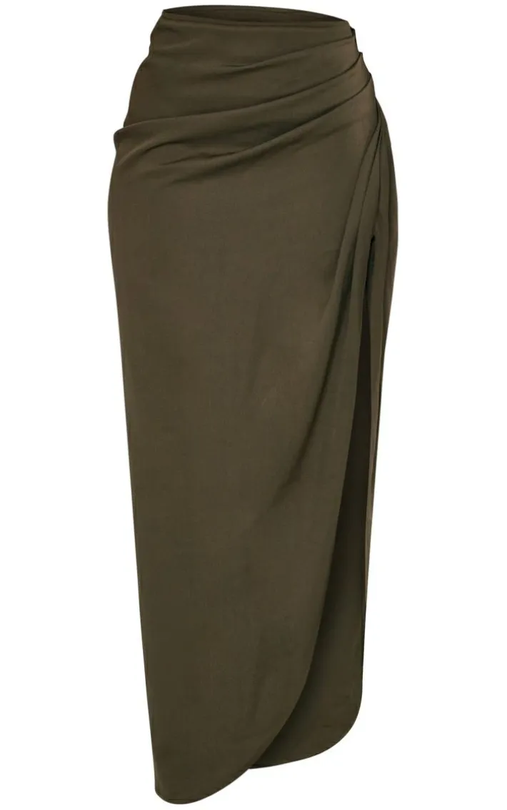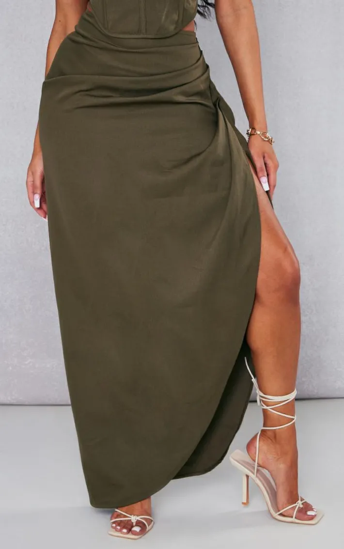 Get that seriously chic vibe on point this weekend with this khaki woven ruched skirt midaxi skirt. With a khaki woven material, ruched skirt detailing and a split hem, what more could you ask for? Whatever your plans are, this midaxi skirt is a yes from us. Shop the look and pair with the matching corset top, strappy heels and a mini bag for the ultimate weekend-worthy look.