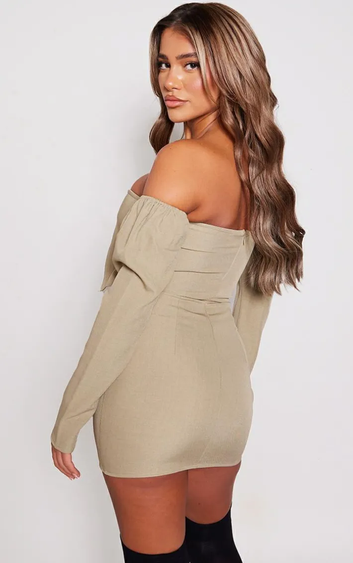 Your weekend wardrobe dilemmas have finally been solved with this khaki woven tailored long sleeve bardot pocket detail mini dress. Brought to you in a khaki hue woven material with a bardot neckline, long sleeves and pocket detailing, we are obsessed. In a flattering tailored fit, you won’t go unnoticed in this mini dress. Just add your fave heels, stockings and your fave accessories to completely elevate the look.