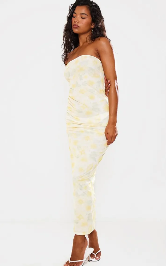 Make heads turn for all the right reasons in this lemon floral print mesh bandeau midaxi dress. Brought to you in a lemon hue mesh material with a dreamy floral print design, a bandeau neckline and a flattering midaxi fit, how can you not be obsessed? Style this lemon dress with heels and some glam accessories to take your look to a whole new level.