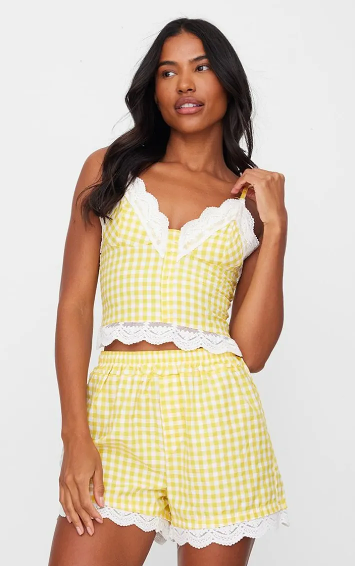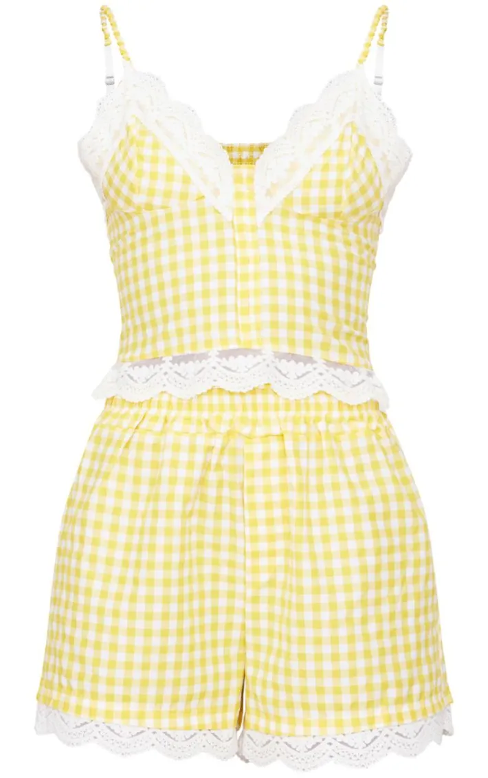 Get ready to have the perfect night in with this lemon gingham check corset PJ set. This set includes a corset top and matching shorts, both in a lemon hue material with an on-trend gingham print design, how can you resist? Simply style this pj set with fluffy slippers to complete the look we’re loving.