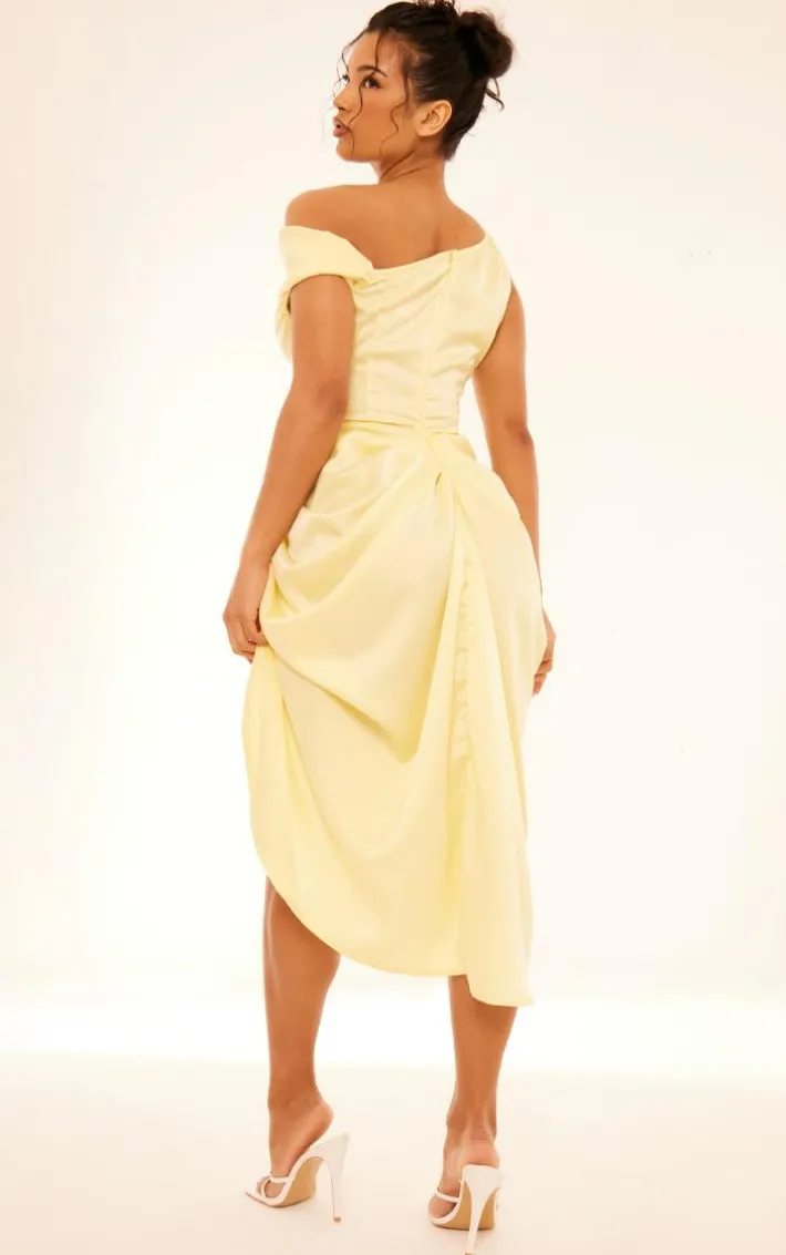 When the dress code calls for all the chic vibes this lemon satin floral off the shoulder draped skirt midi dress is the answer to all your what-to-wear dilemmas. Made from a lemon satin material with an off the shoulder design and a draped skirt, how could you not be obsessed? Style seamlessly with clear heels, gold accessories and a mini bag for a luxe finish that won’t go unnoticed.