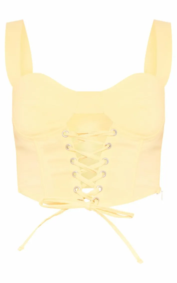 Add some statement hues to your weekend wardrobe with this lemon stretch woven boned lace up crop top. Brought to you in a lemon stretch woven material with a boned design, you are sure to be showing off your shape in all the right places. Its lace up fastening is sure to have you tapping into your feminine side. Team this crop top with a pair of wide leg jeans and a pair of heels.