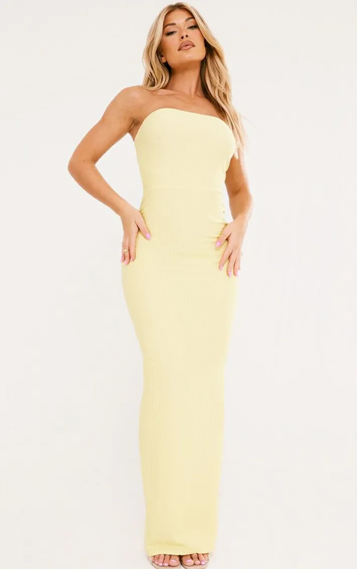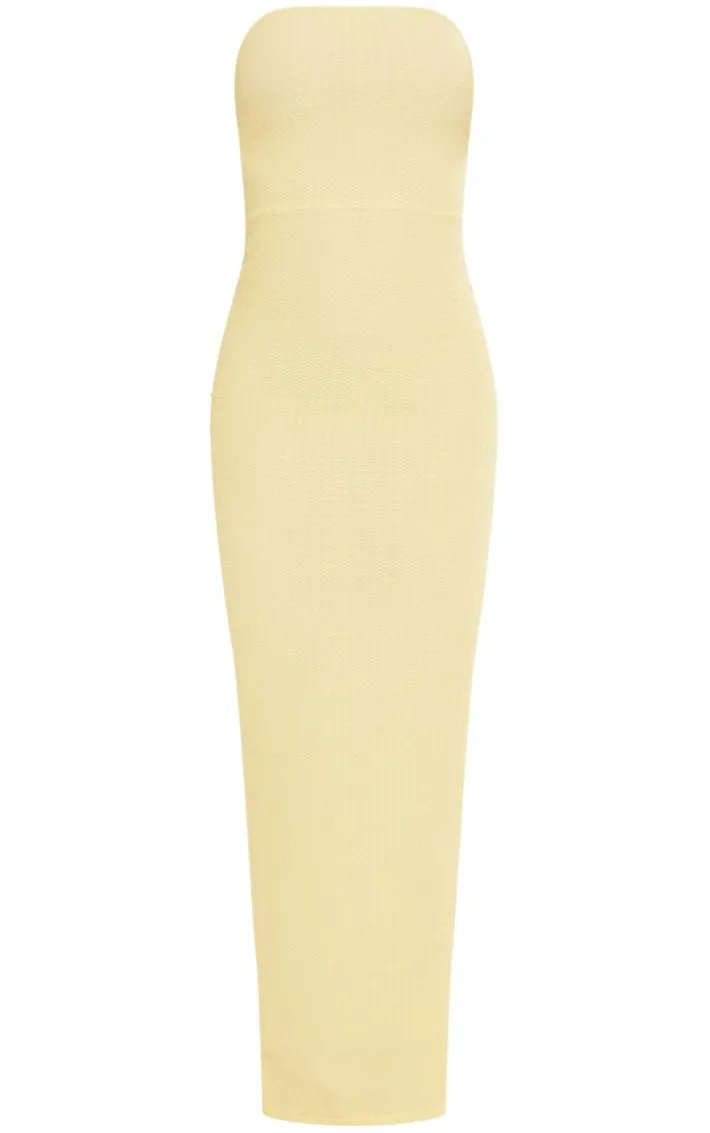 Brighten up your wardrobe with this lemon textured bandeau split front midaxi dress and be sure to steal all the stares. Its lemon-textured material is super fresh and its bandeau neckline adds a chic touch to your look. This midaxi dress also features a split hem which is sure to take your look to the next level. For a flawless finish, add your go-to heels and gold accessories.