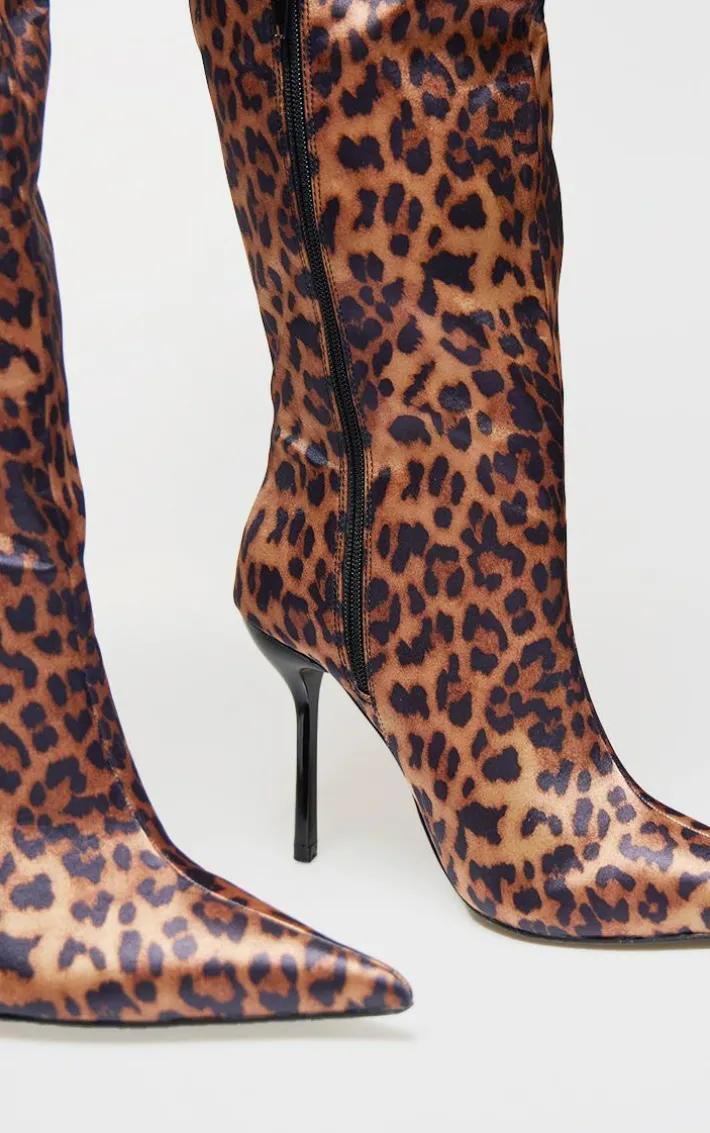 Introduce some new season prints into your shoe collection with these leopard satin point toe knee high stiletto heeled boots. Brought to you with a fierce high stiletto heel, leopard print pattern and a point toe design, these heeled boots aren’t to be missed. Style with matching prints for an unmissable combo.
