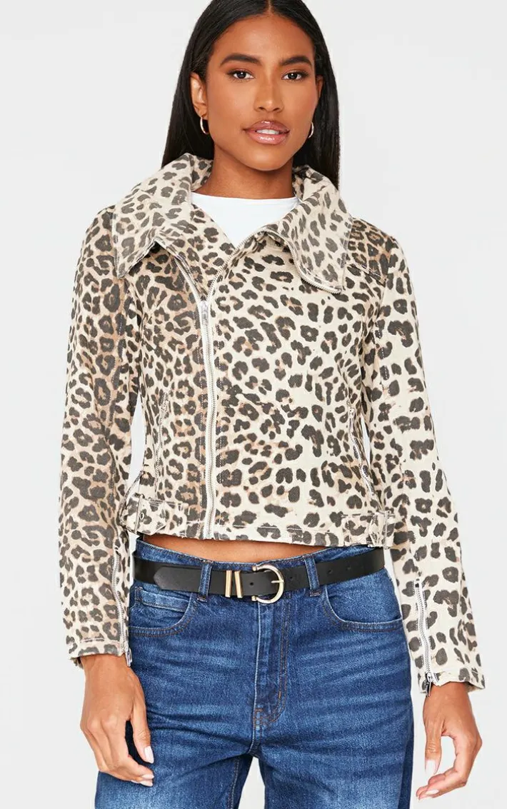 This light brown leopard print biker style denim jacket is at the top of our new season hit list. Brought to you in a light brown denim material with a leopard print design and a zip through fastening, how can you resist? It’s biker style is sure to add an edge to any look. Style this light brown jacket with a crop top, hot pants and chunky boots for a look we’re obsessed with.