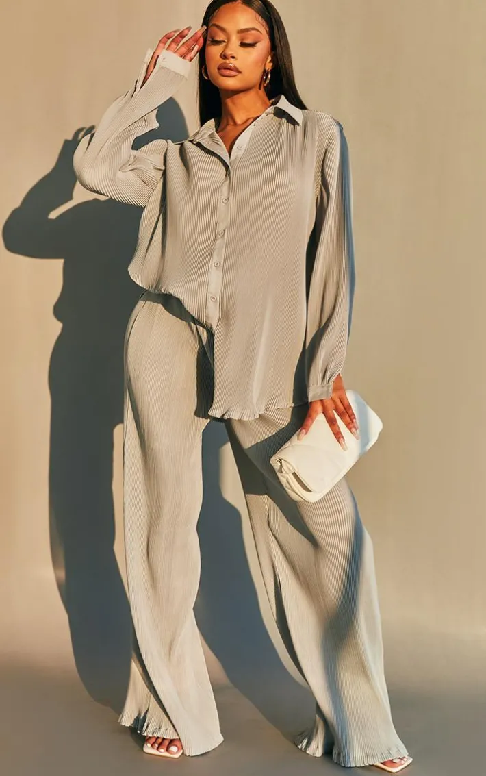 these bottoms are everything we are loving right now. Featuring a light grey plisse material with a high waisted design and a wide leg fit, they are a must-have. Style with the matching shirt and your fave heels for the ultimate date night ‘fit.