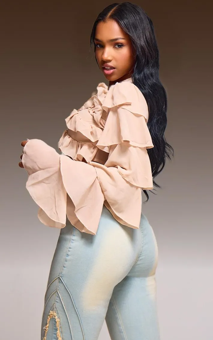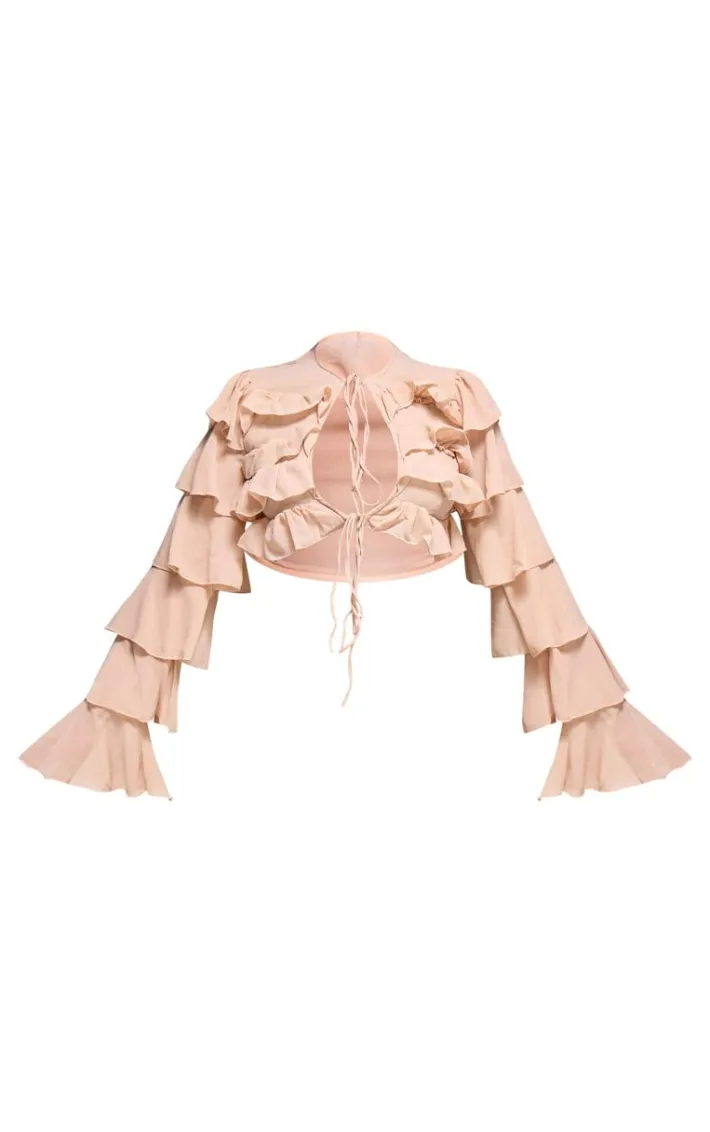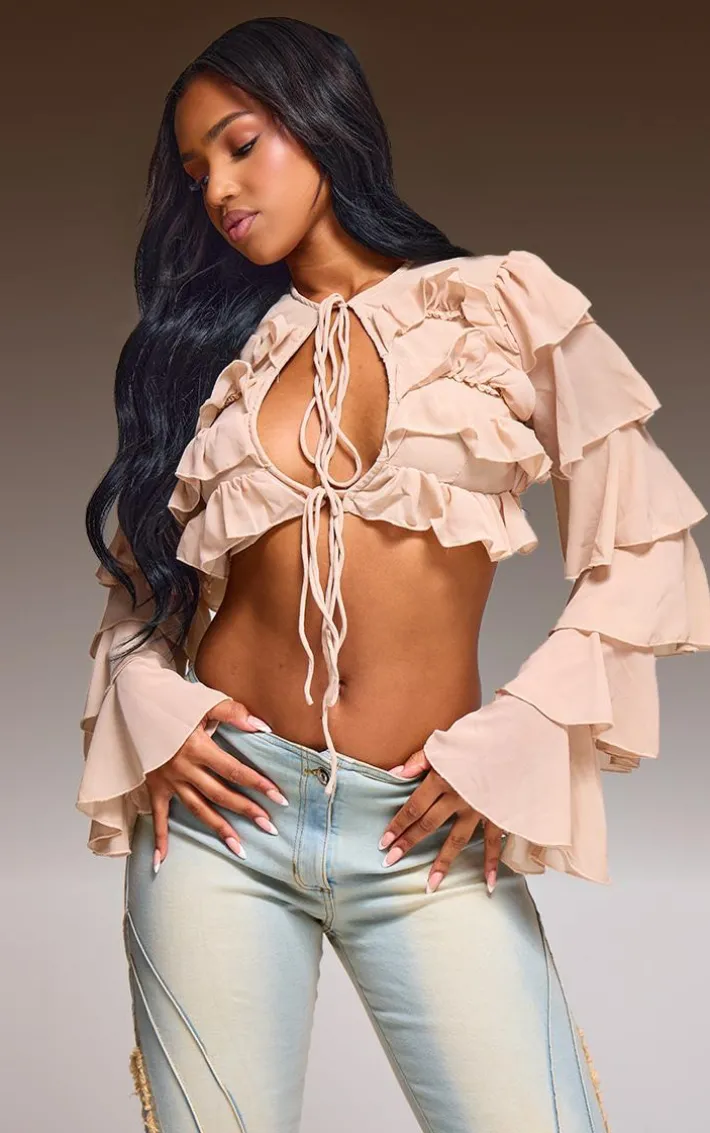 Your wardrobe is calling out for this light nude ruffle tie detail crop top for your new season look. Brought to you in a light nude material with a chiffon ruffle design and a tie detail, how could you resist? This crop top pairs perfectly with some flared jeans and gold accessories for a weekend-worthy finish.